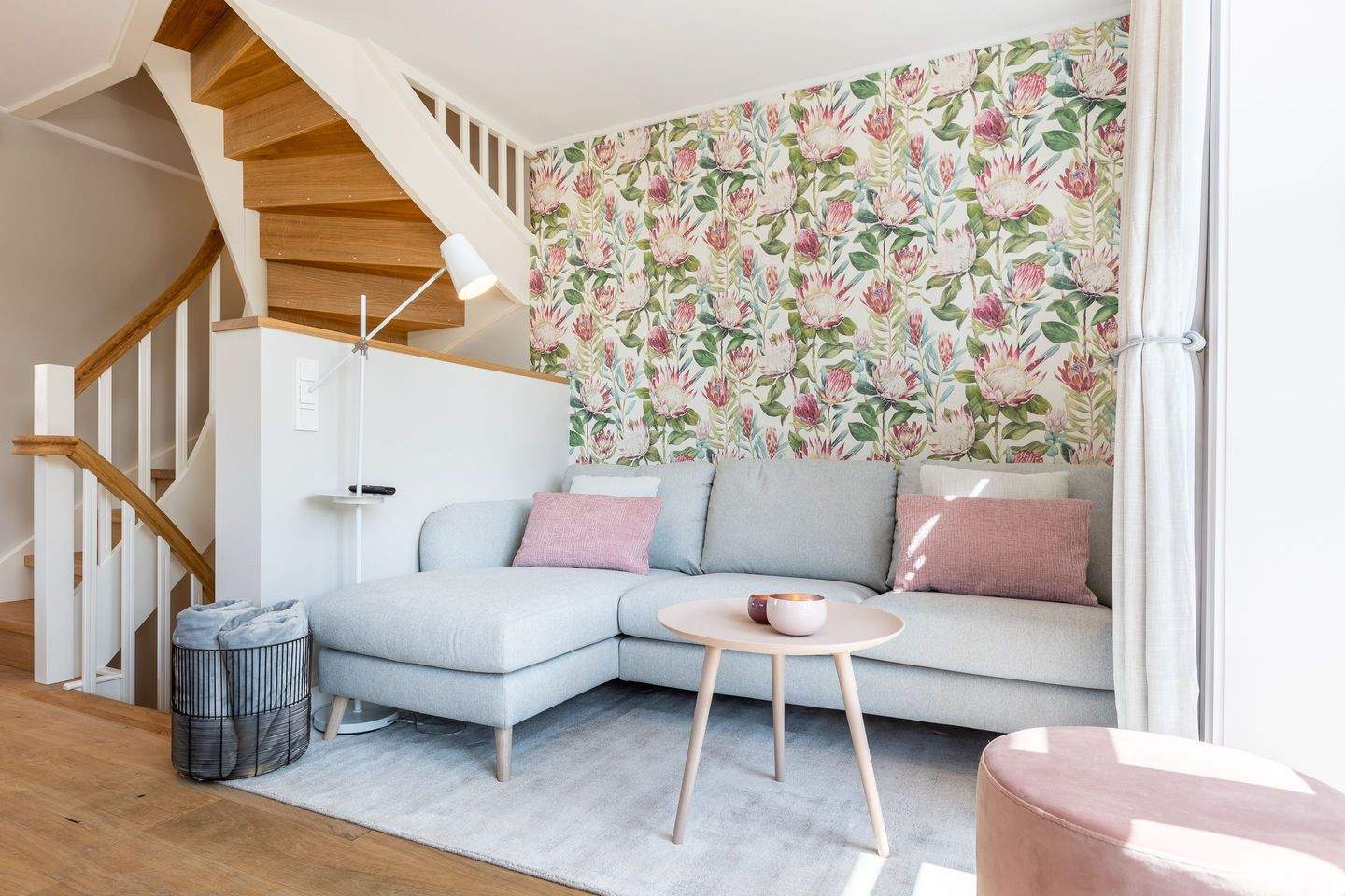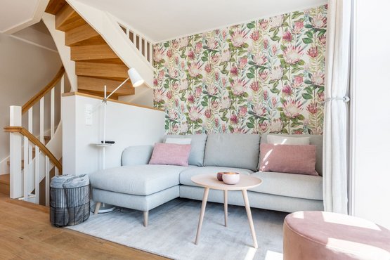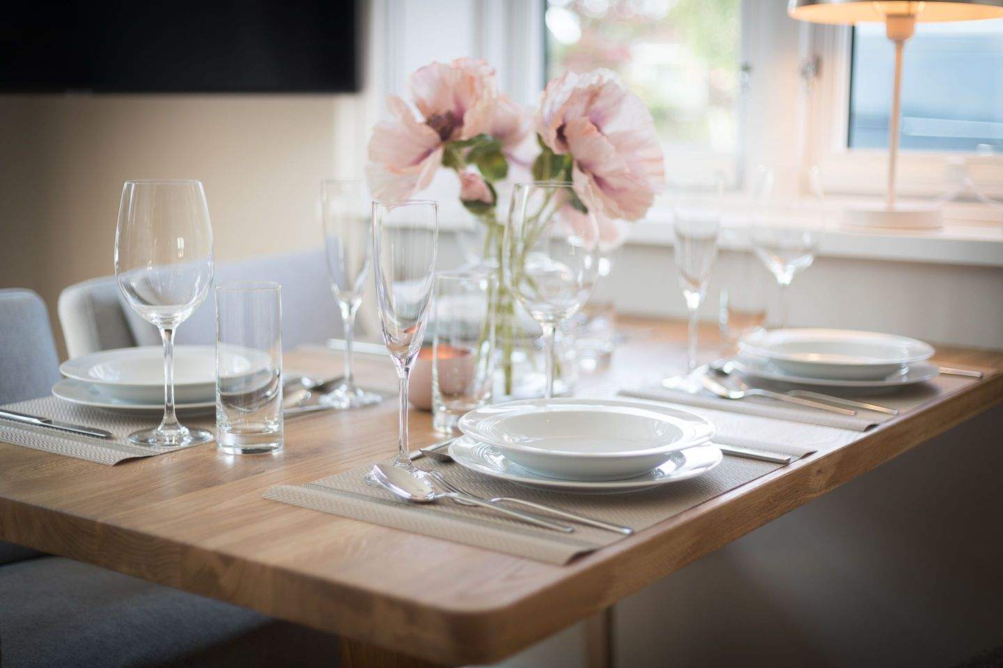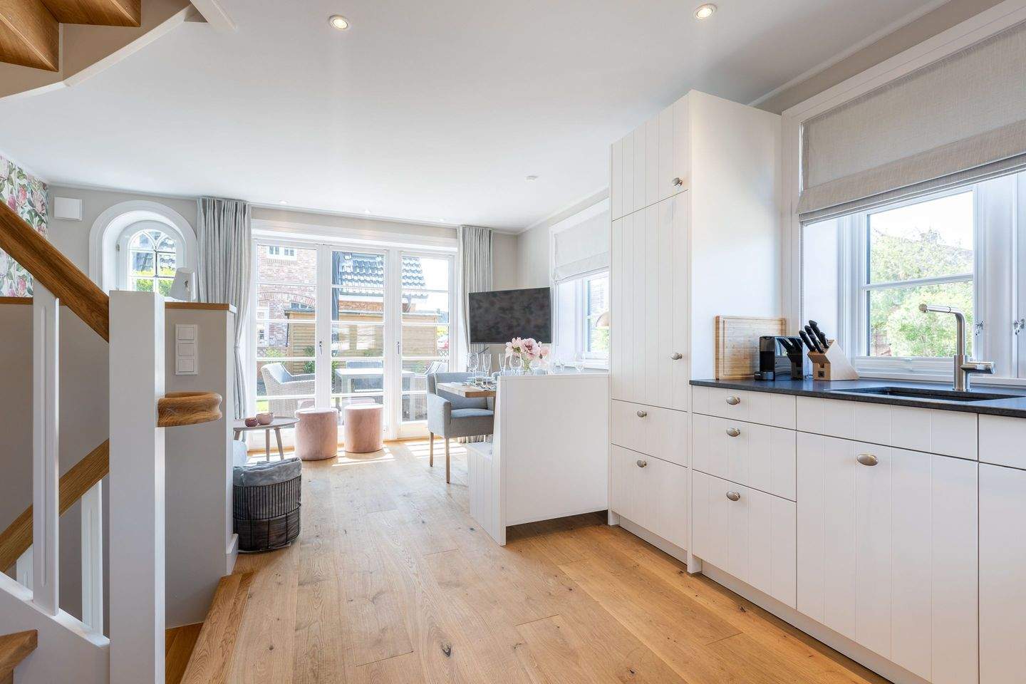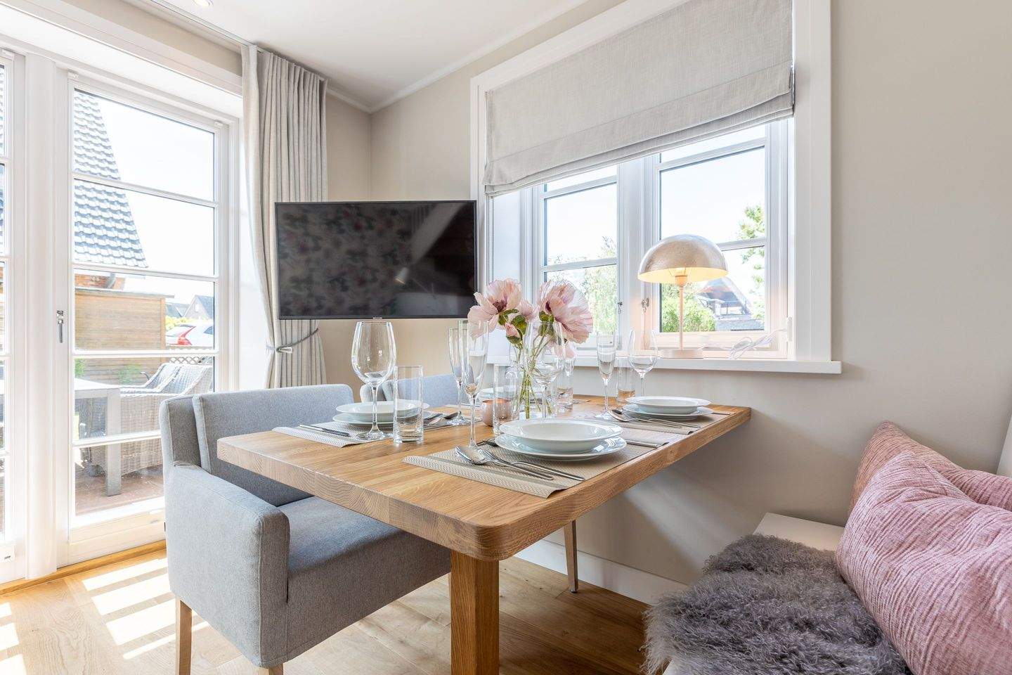Helles Wohn-Esszimmer mit gemütlichem Sofa, großem Smart-TV und direktem Zugang zur Süd-Terrasse und kleinem Garten.