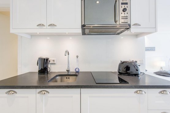 Offene Einbauküche mit Mikrowelle, Geschirrspüler, 2er-Cerankochfeld und üblichen Komfort.