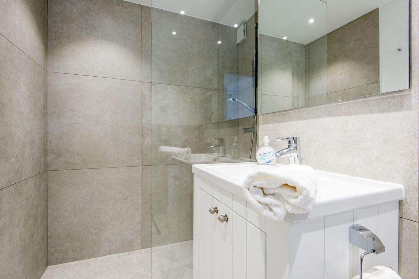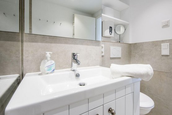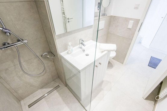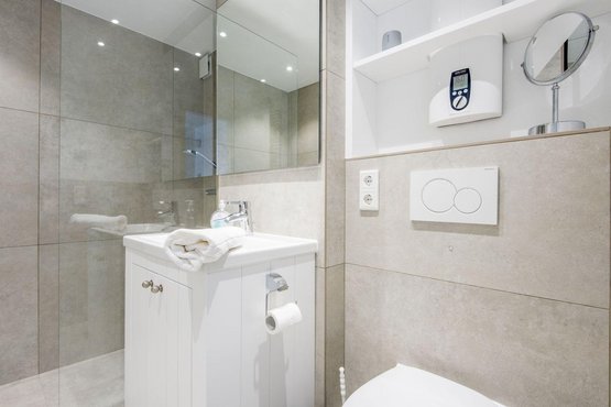Duschbad mit WC, Handtuchwärmer und Föhn.