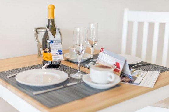 Großzügiger Wohn- und Schlafbereich mit Doppelbett (2 x 90x200cm) und Sofa, TV. Tisch mit zwei Stühlen als Essecke. Direkter Zugang zum Balkon nach Westen.