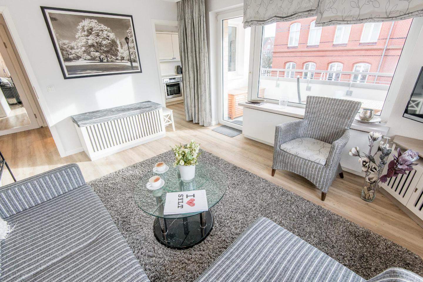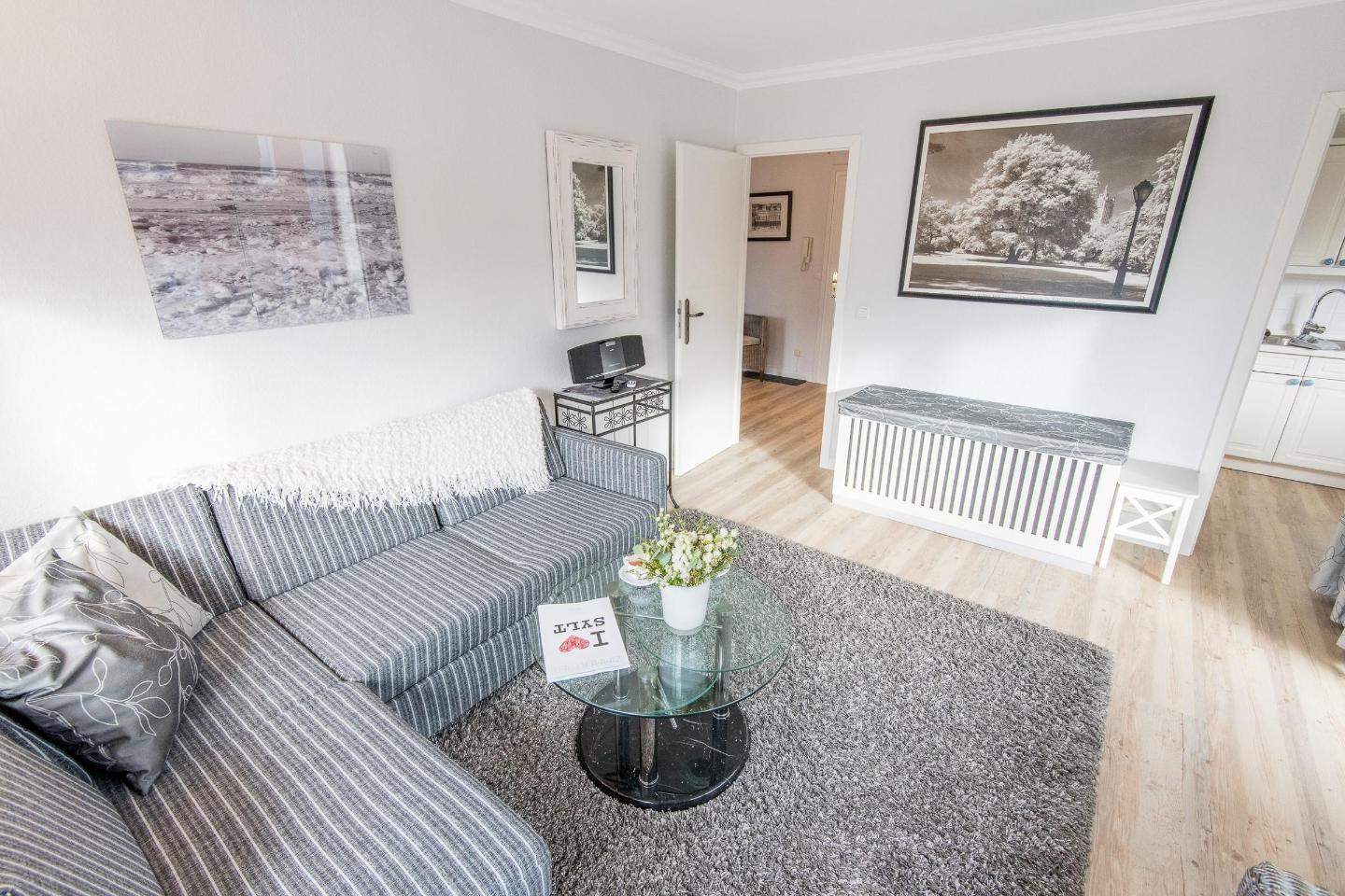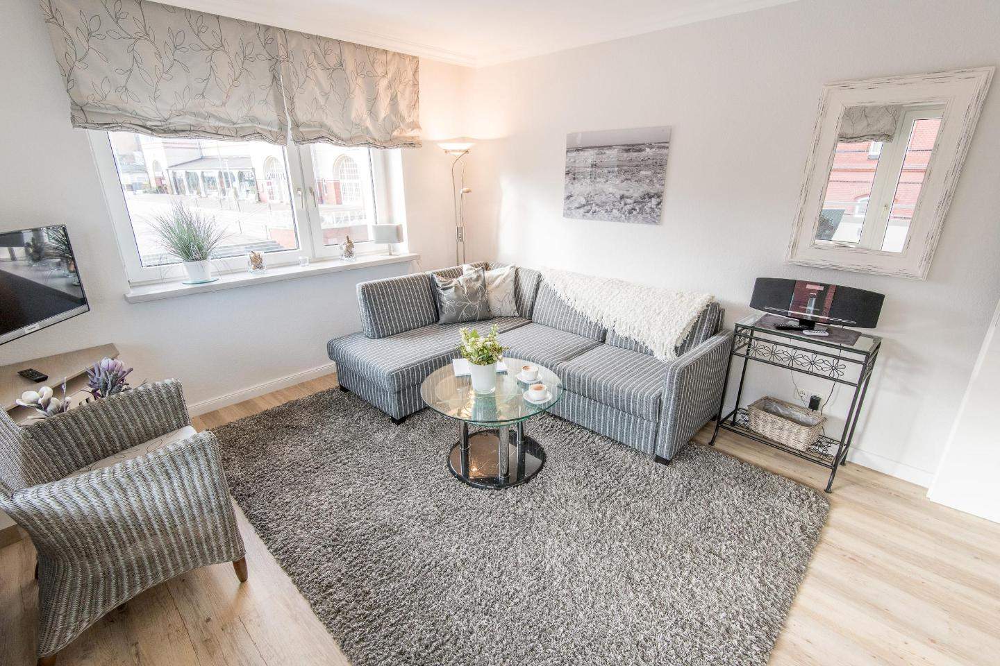 Sehr zentrale Lage am Markt und Rathaus in Westerland auf Sylt. Pizza Restaurant im Haus. Nichtraucherwohnung. Wohnzimmer mit Ecksofa, Sessel und TV. Direkter Zugang zum großen Balkon nach Südwesten mit herrlichem Ausblick aufs Rathaus, den Stadtgarten und den Wochenmarkt.