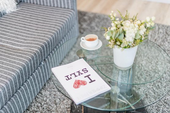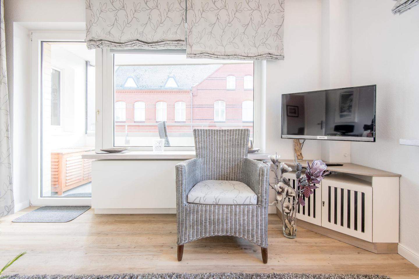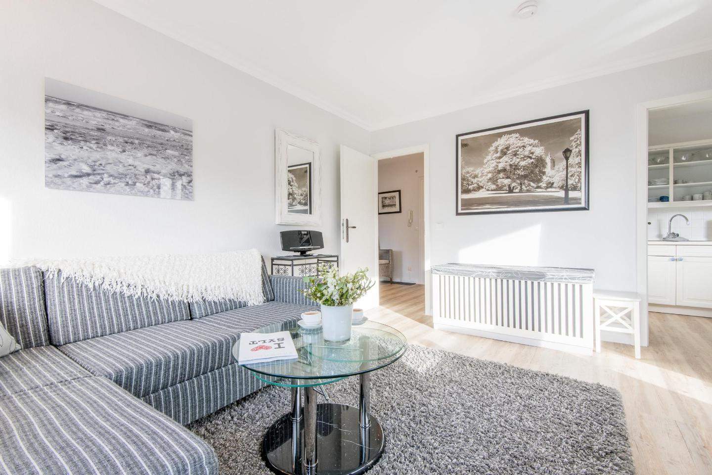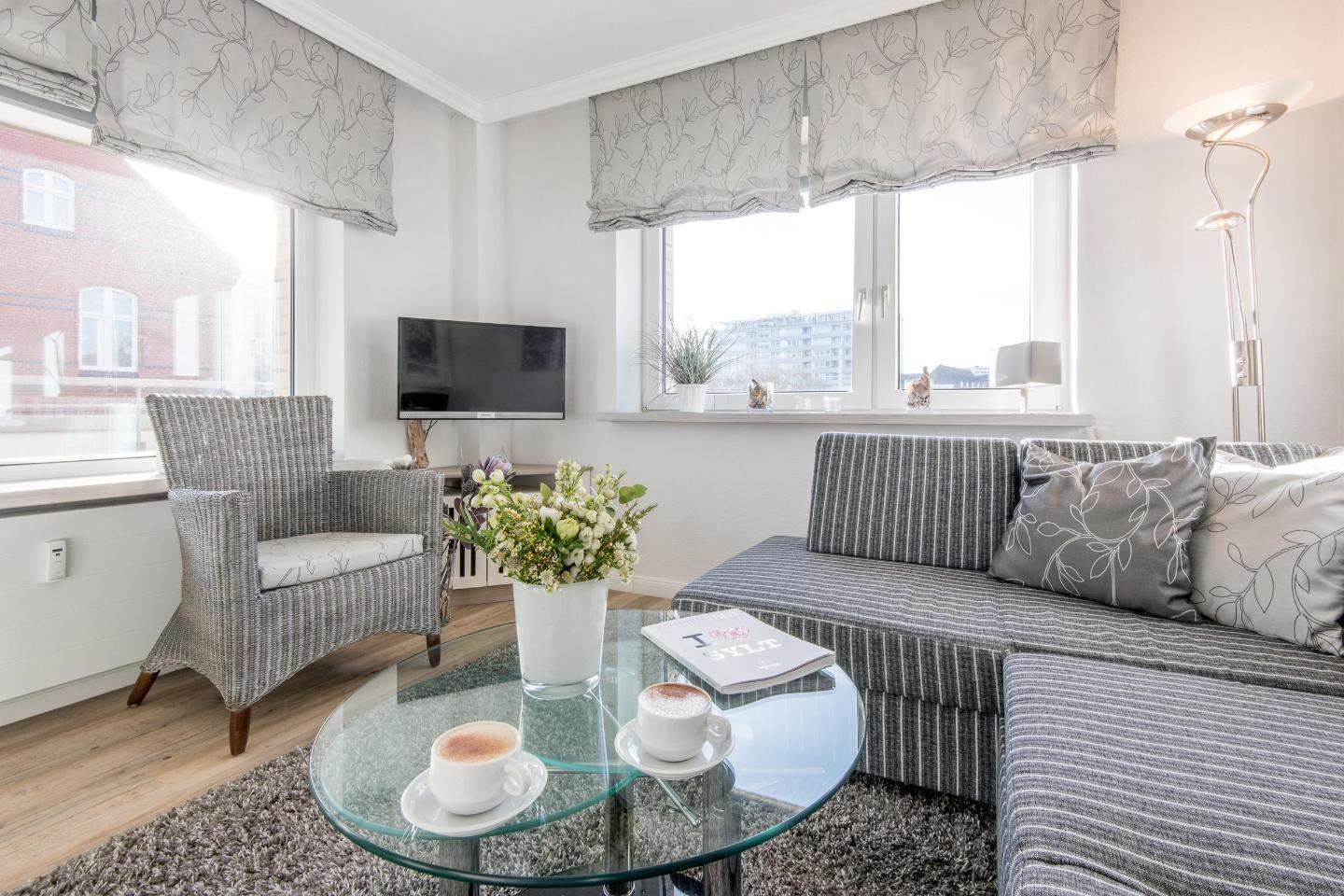 Sehr zentrale Lage am Markt und Rathaus in Westerland auf Sylt. Pizza Restaurant im Haus. Nichtraucherwohnung. Wohnzimmer mit Ecksofa, Sessel und TV. Direkter Zugang zum großen Balkon nach Südwesten mit herrlichem Ausblick aufs Rathaus, den Stadtgarten und den Wochenmarkt.