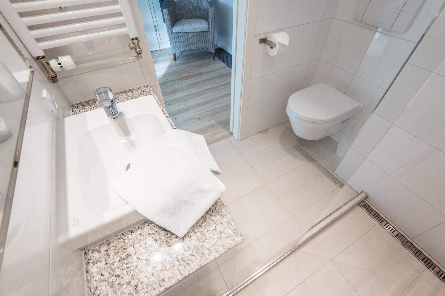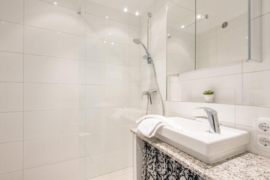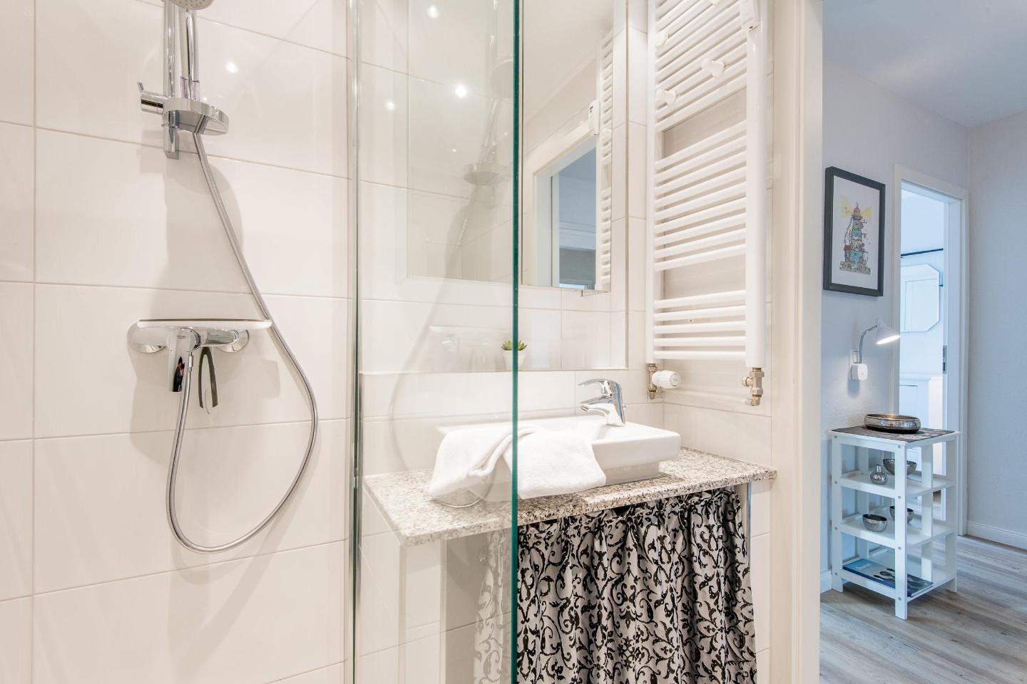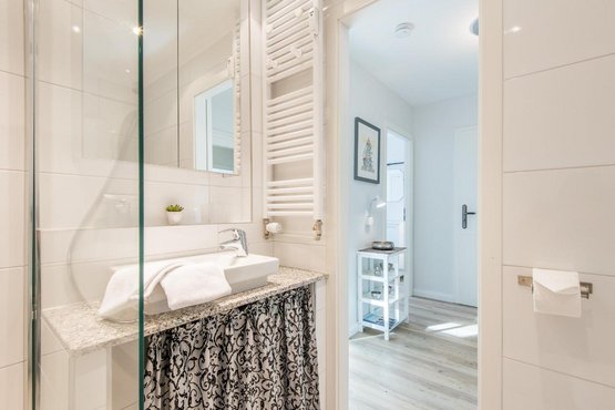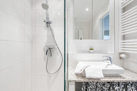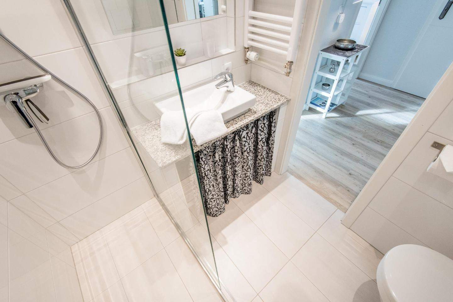 Badezimmer mit Dusche, WC, Handtuchwärmer und Fön.