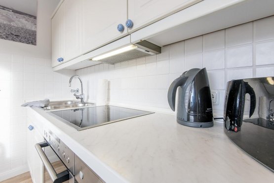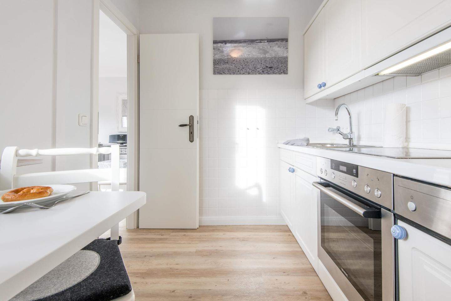 Separate Küche mit Esstisch für 2 Personen, Backofen, Geschirrspüler, Mikrowelle und dem üblichen Komfort.