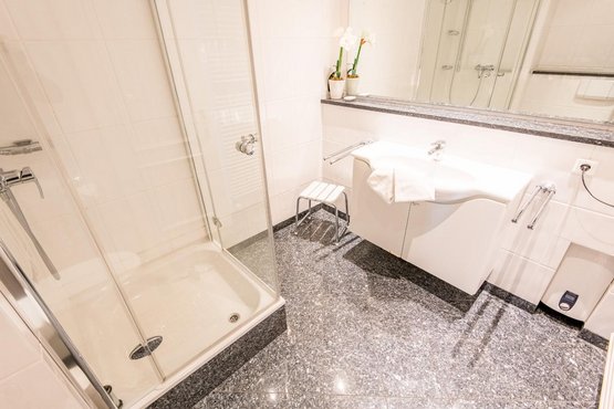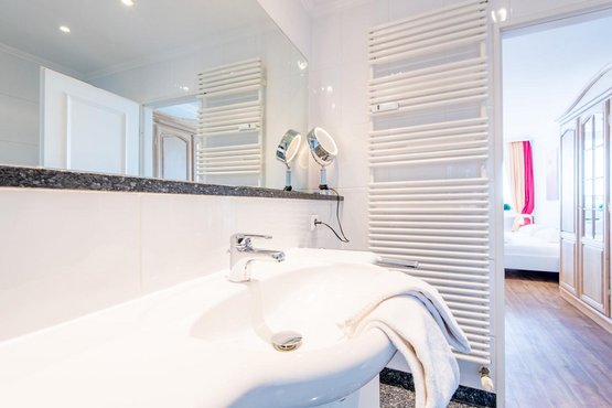 Badezimmer (Duschbad) en Suite zum Schlafzimmer mit Dusche, WC, Handtuchwärmer und Föhn.