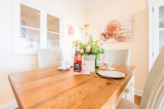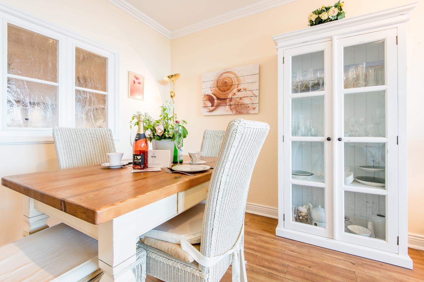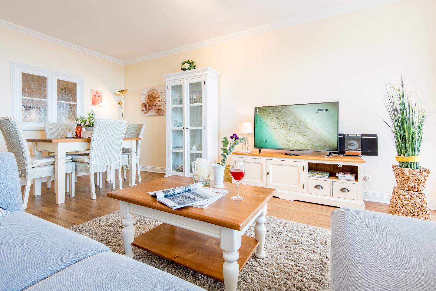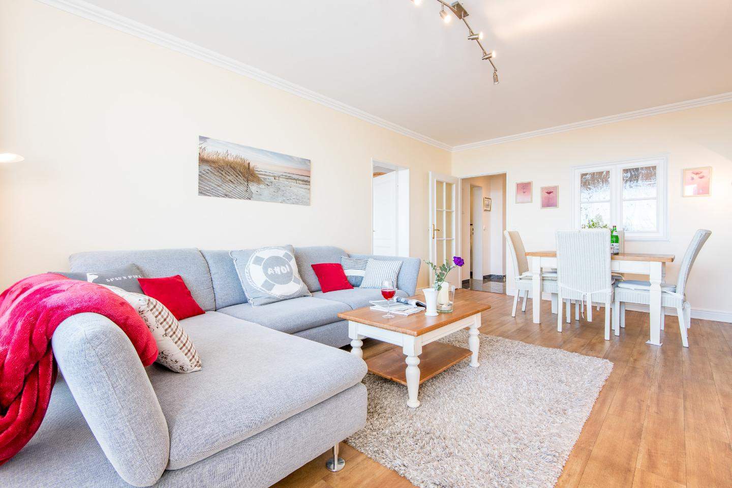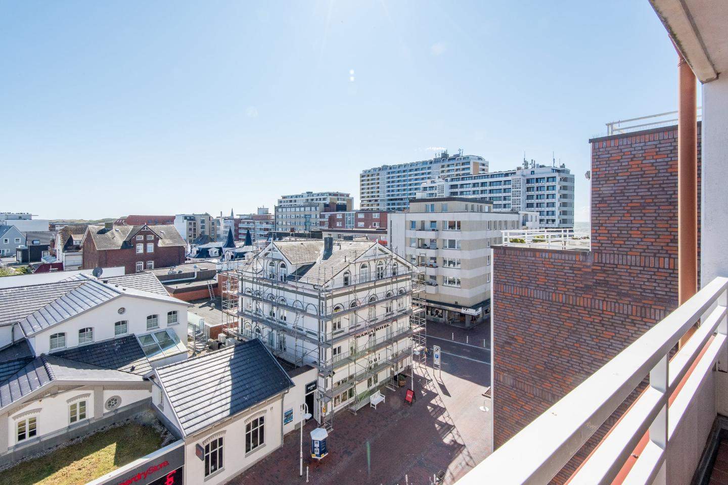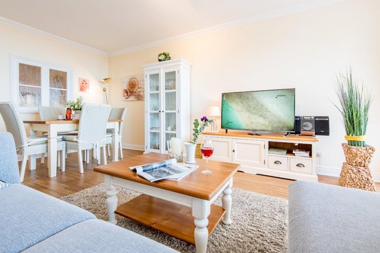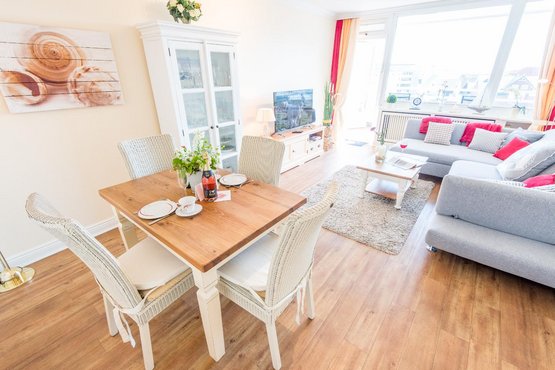 Sehr nah zum Strand und zur Sylter Welle. Alle Annehmlichkeiten der Innenstadt direkt vor der Haustür. Herrlicher Ausblick über die Dächer Westerlands, die Fußgängerzone und bis zur Strandpromenade. Wohnzimmer mit Sofa, Entspannungssessel, TV und Esstisch für 4 Personen. Direkter Zugang zum möblierten Balkon nach Süden. Haustiere sind im gesamten Haus nicht erlaubt.