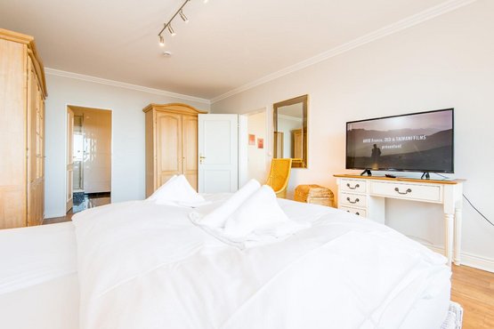 Schlafzimmer mit Doppelbett (2x 100x200cm), kleinem Schreibtisch, Kleiderschrank, TV und direktem Zugang zum möblierten Balkon nach Süden.