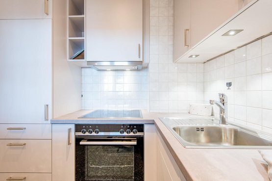 Separate Küche mit 4-flammigem Herd, Geschirrspüler und allem Komfort.