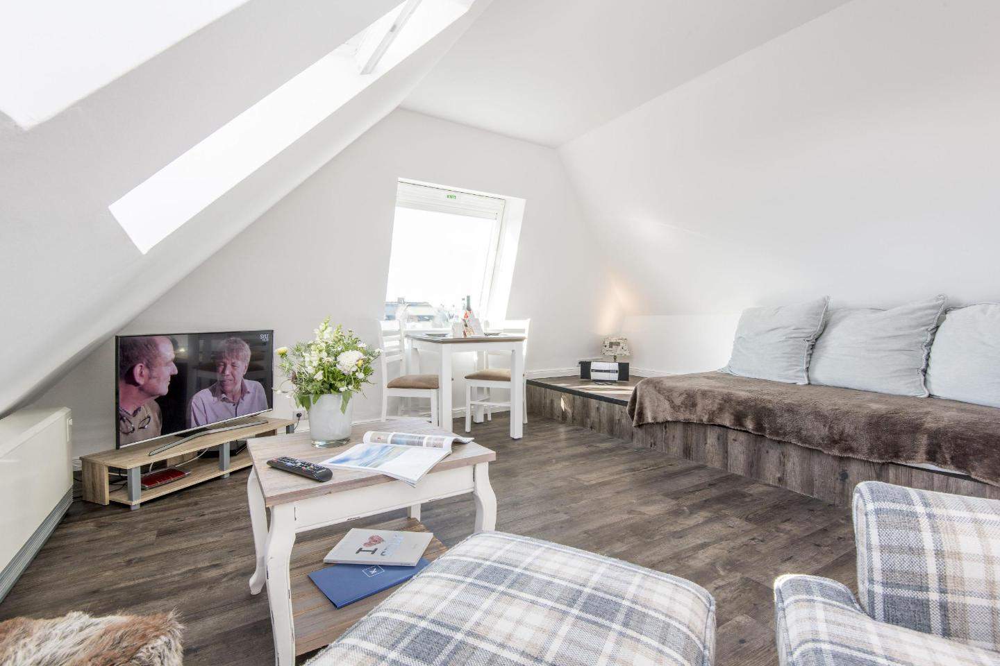Schnuckeliges Wohnzimmer mit Liegewiese, TV und kleinem Meerblick.