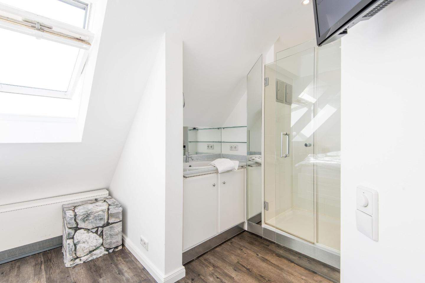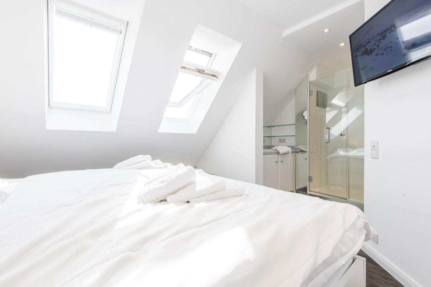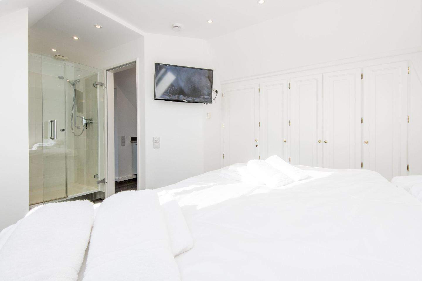Schlafzimmer mit Doppelbett (2x 90x200cm), Einbauschrank und TV.En-Suite-Badezimmer (Duschbad) mit Dusche, Föhn und Tageslicht.