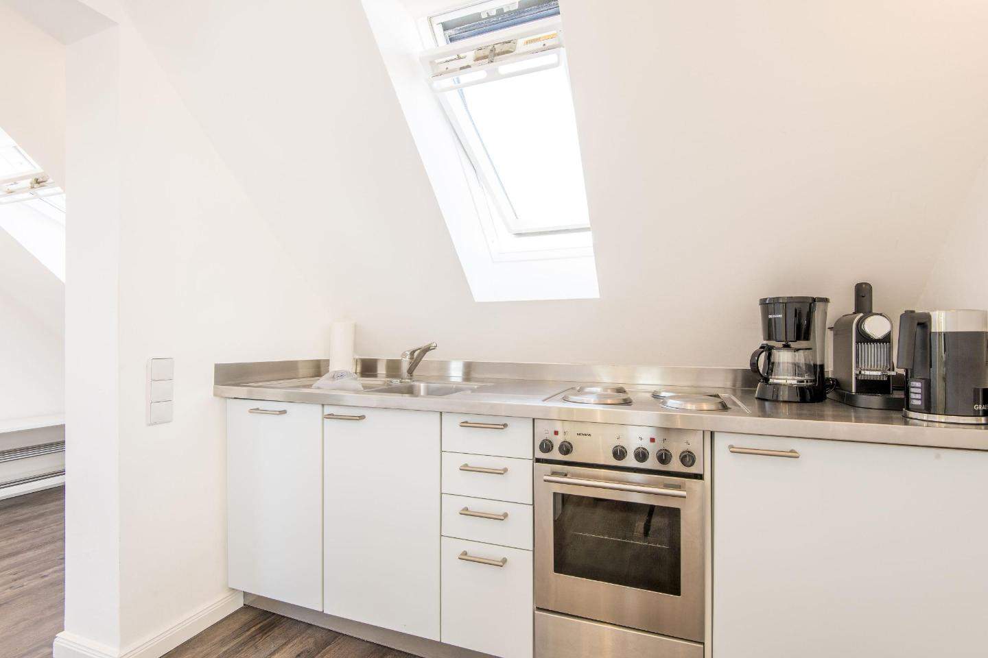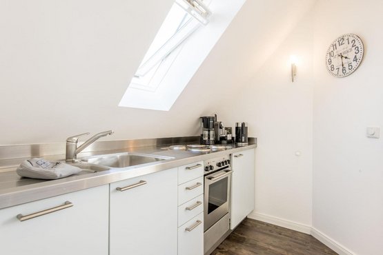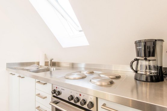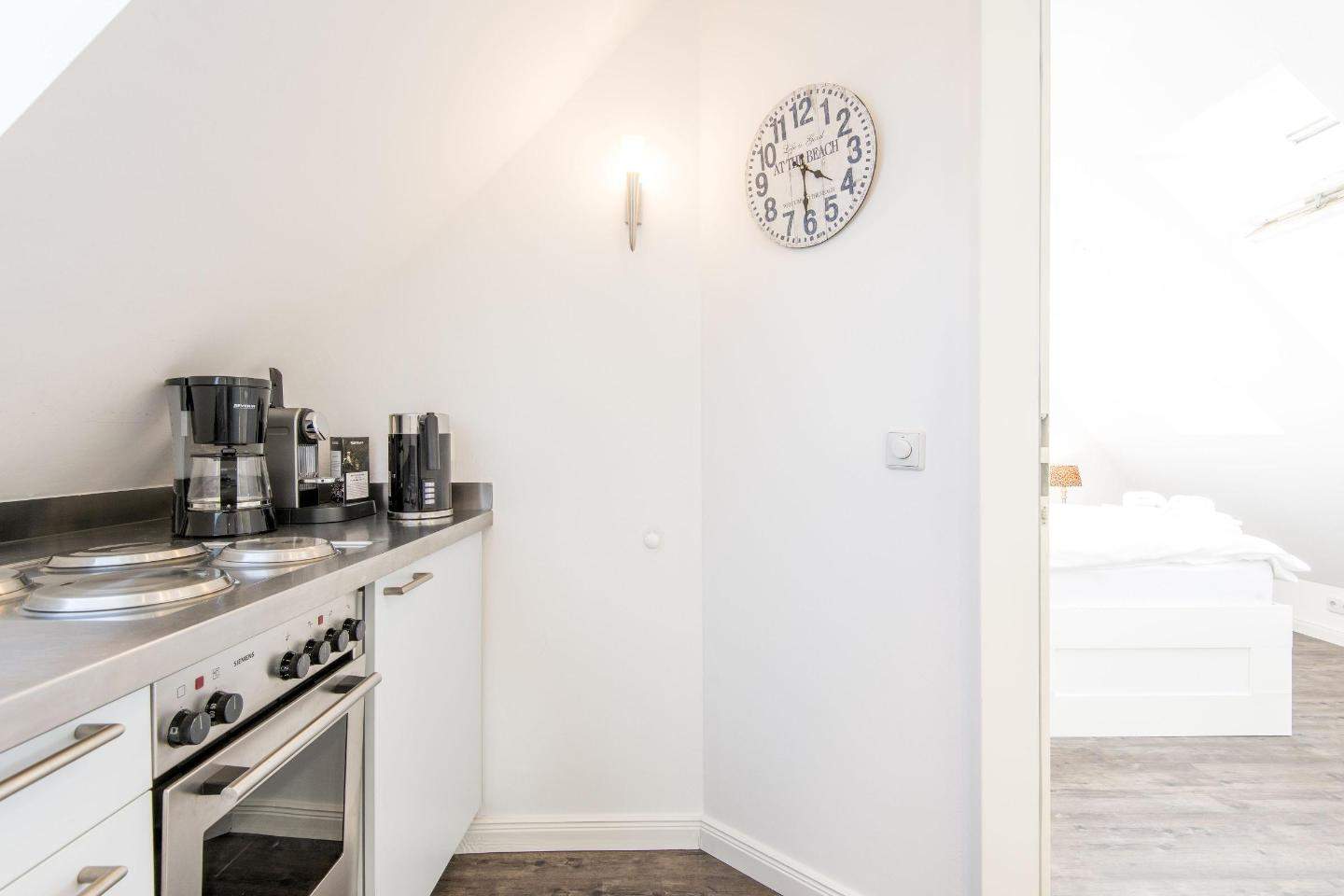 Halboffene Pantry-Küche mit 4-flammigem Herd, Krups Nespresso-Maschine und viel Komfort.