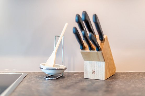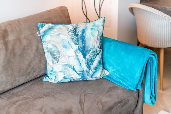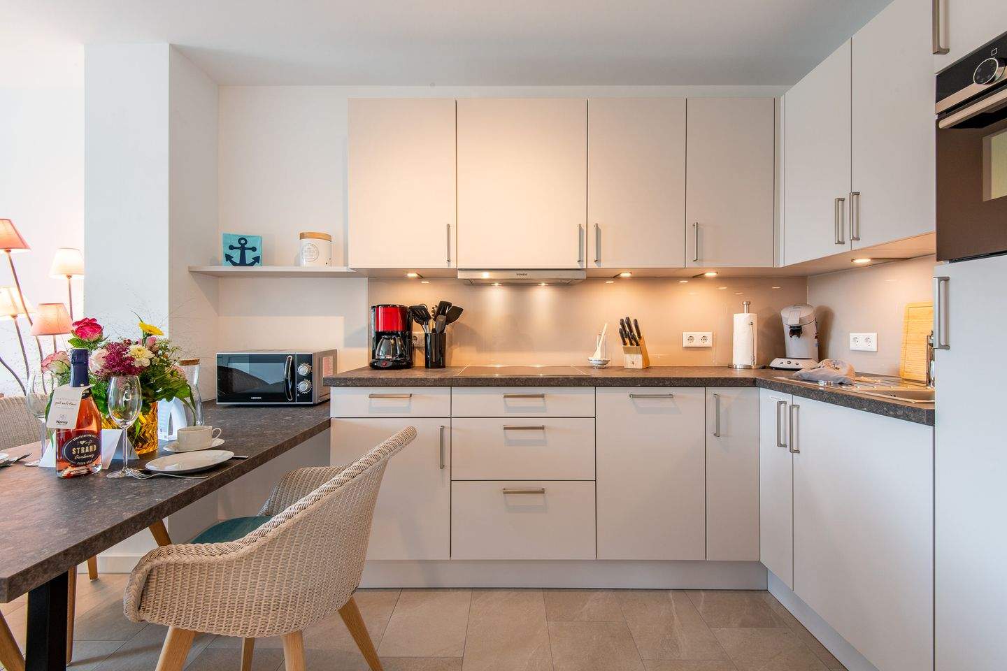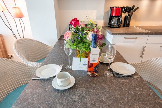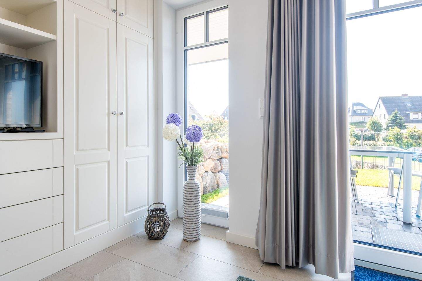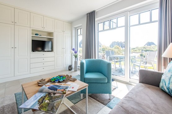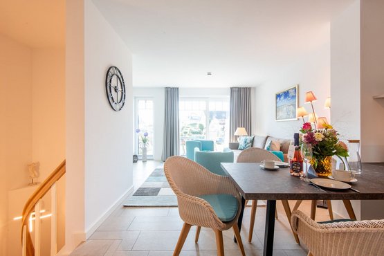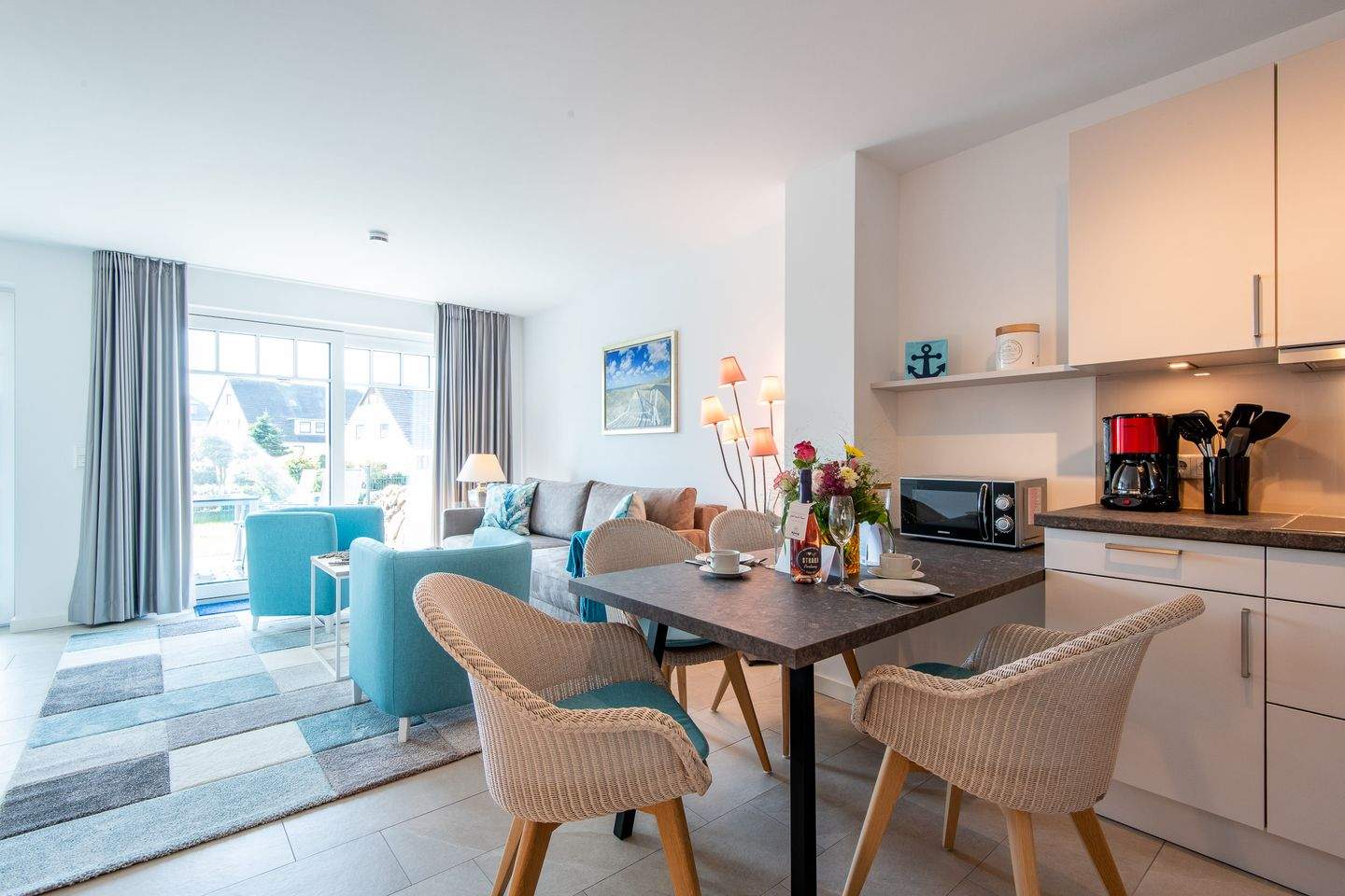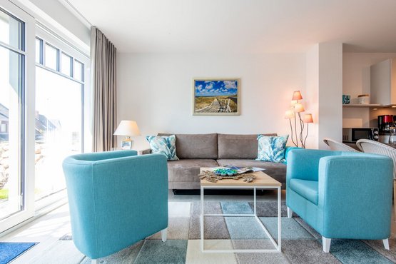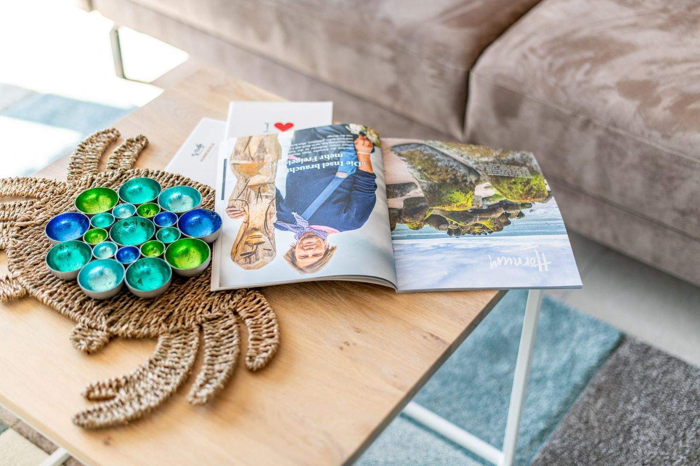 Das Wohnzimmer verfügt über eine gemütliche Loungeecke mit Schlafsofa, in der Sie entspannen und die Seele baumeln lassen können. Von hier aus gelangen Sie auch auf die Terrasse, wo Sie die frische Nordseeluft genießen können. Hunde willkommen.