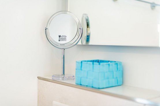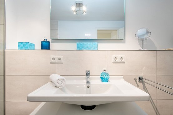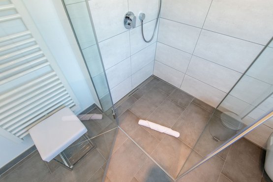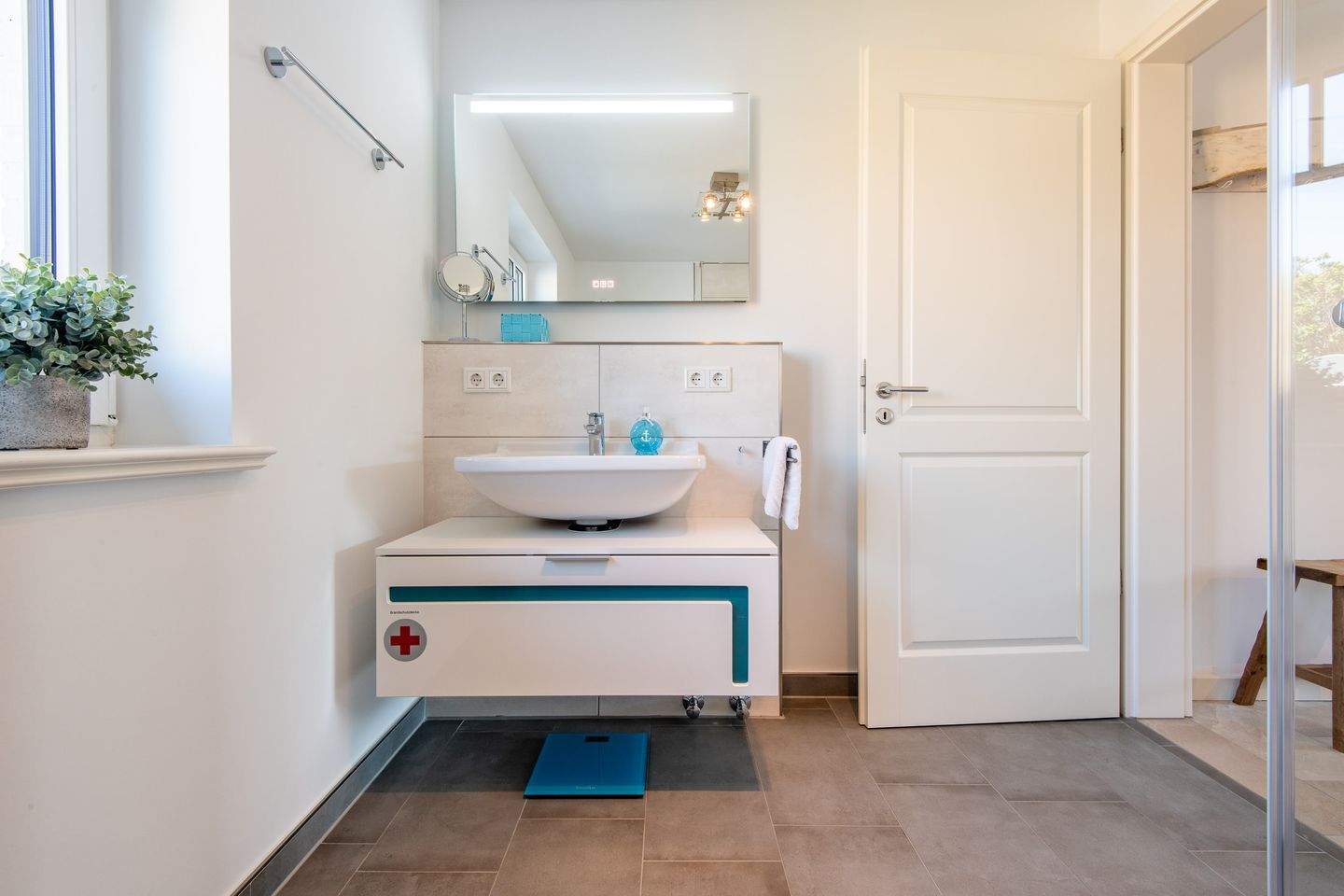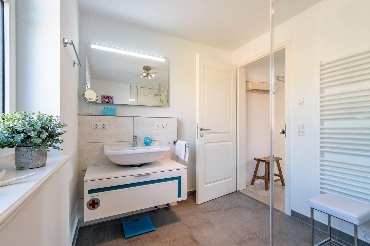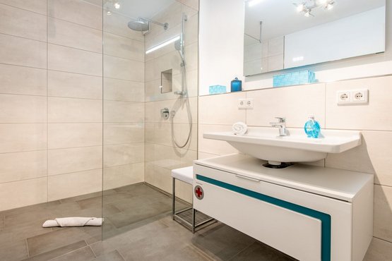 1. Badezimmer mit großer ebenerdiger Dusche und allem Komfort.