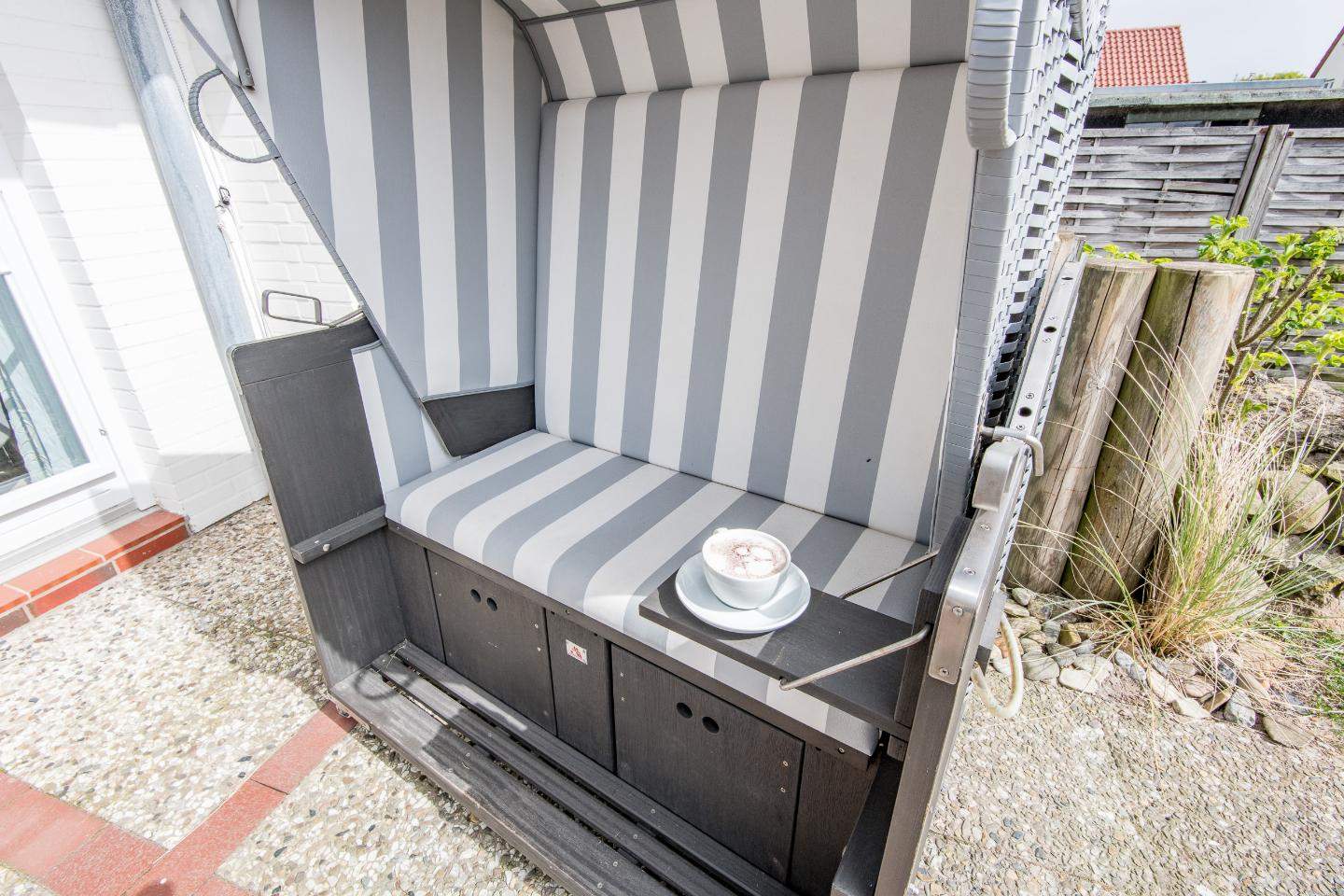 Direkter Zugang zur möblierten Gartenterrasse nach Süden mit Strandkorb.