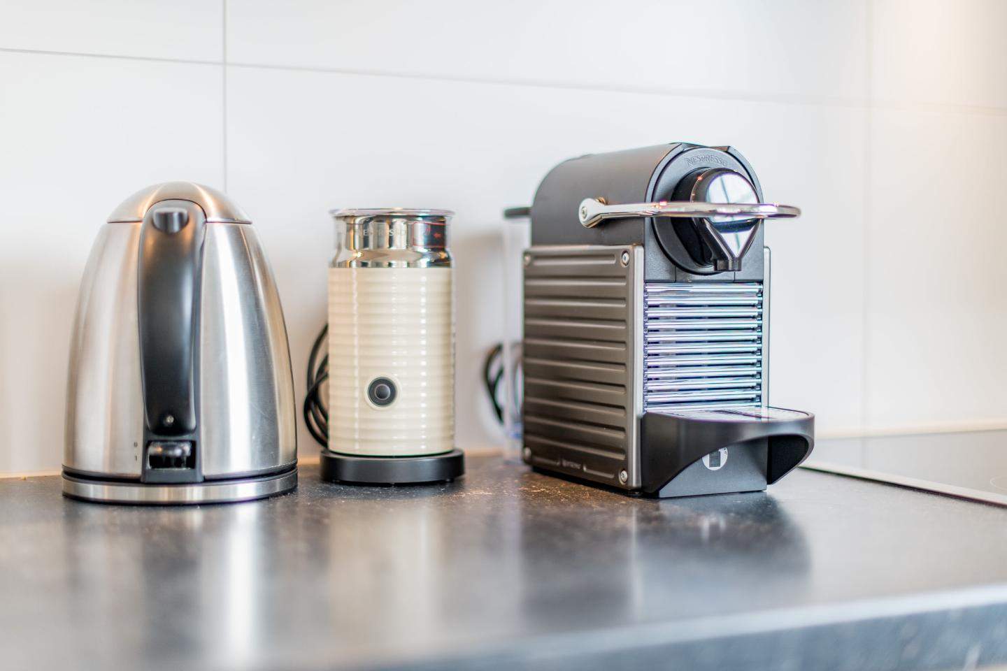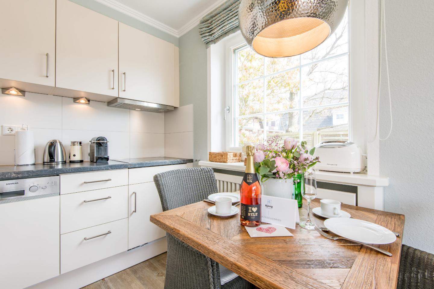 Offene Küche mit Cerankochfeld, Geschirrspüler, Mikrowelle, Nespresso Maschine und Milchaufschäumer und viel Komfort.