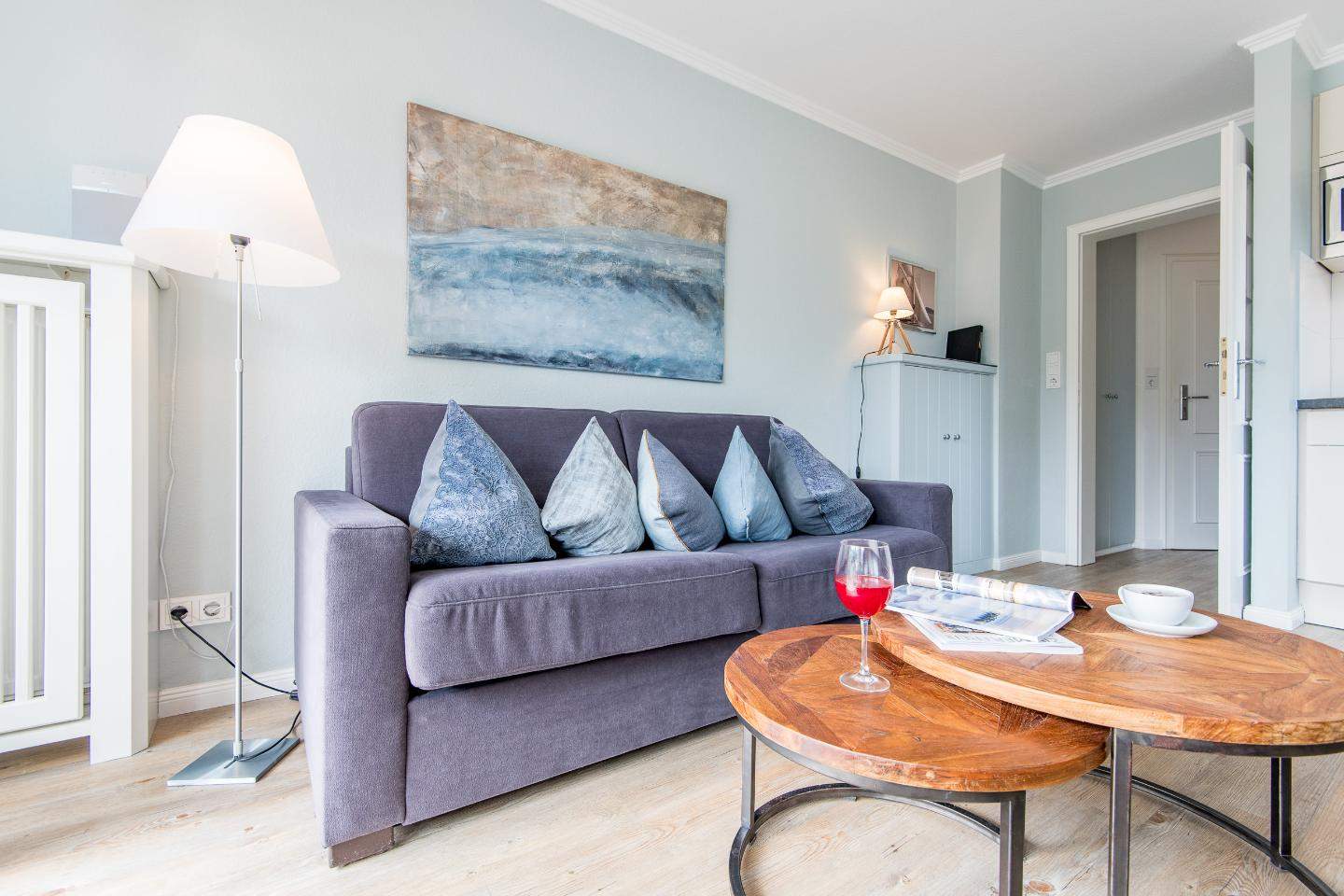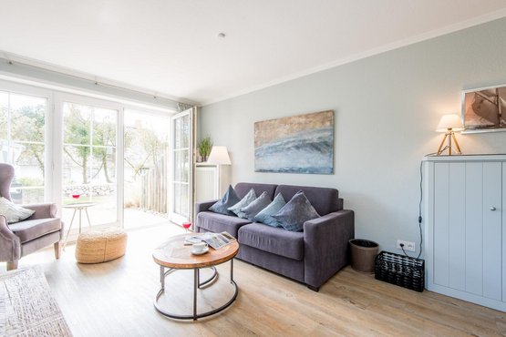 Das Wohnzimmer ist mit einem gemütlichem Sofa und einem bequemen Sessel ausgestattet. Dank des großen TV mit Media Receiver und Netflix Zugang, sind erholsame Stunden in Ihrem Urlaubsdomizil garantiert. Zudem verfügt die Wohnung auch über eine Bose Soundanlage.