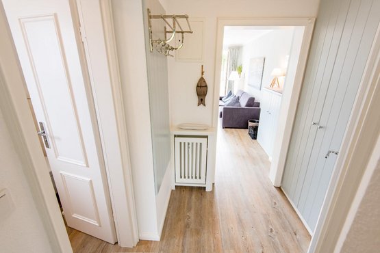 Flur mit Garderobe im Eingangsbereich. Waschmaschine und Trockner gegen Gebühr im Haus. Ohne Pkw-Stellplatz, WLAN vorhanden.