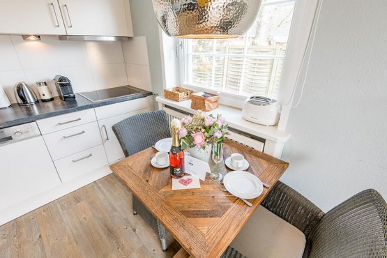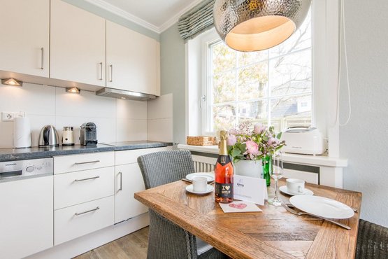 Ein Esstisch für 2 Personen und die hochwertigen Tischlereinbauten runden das stimmige Wohnkonzept ab.