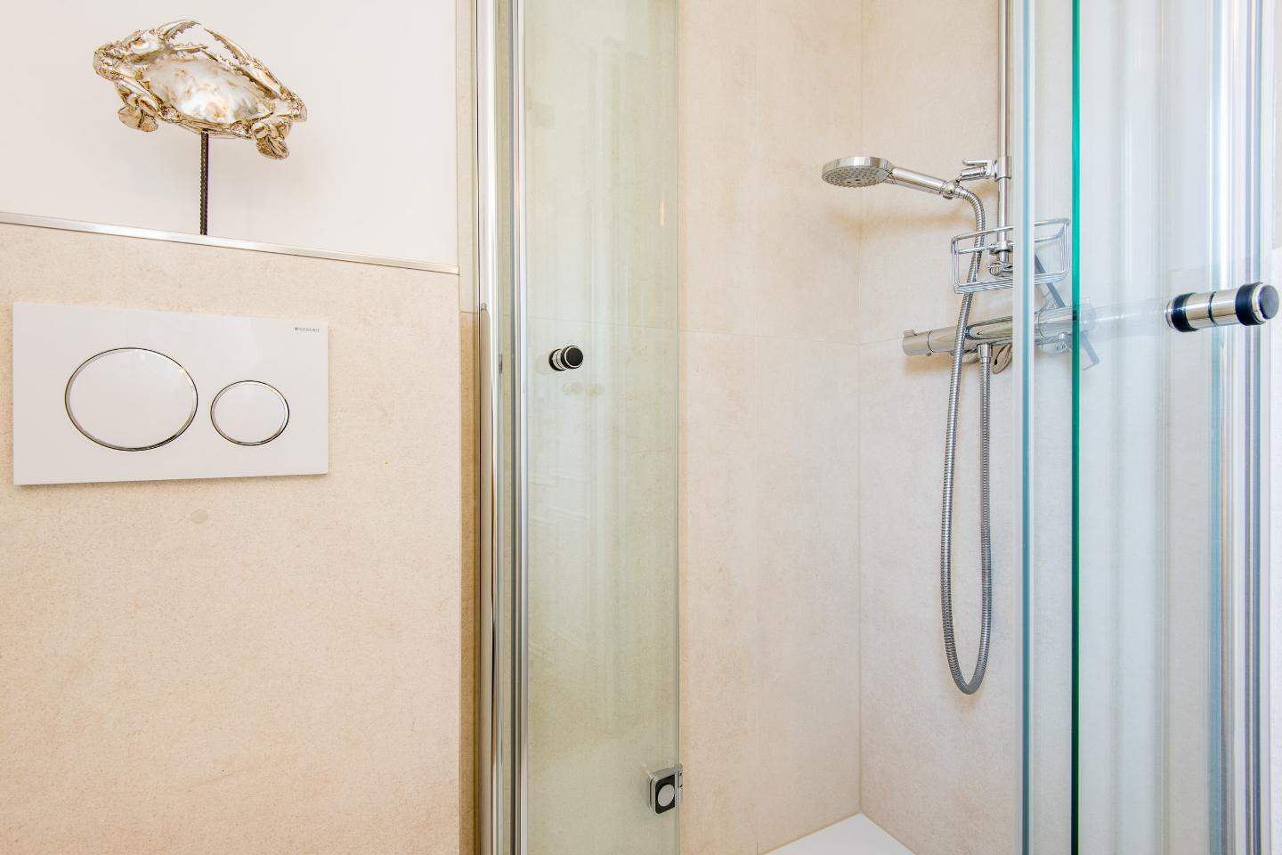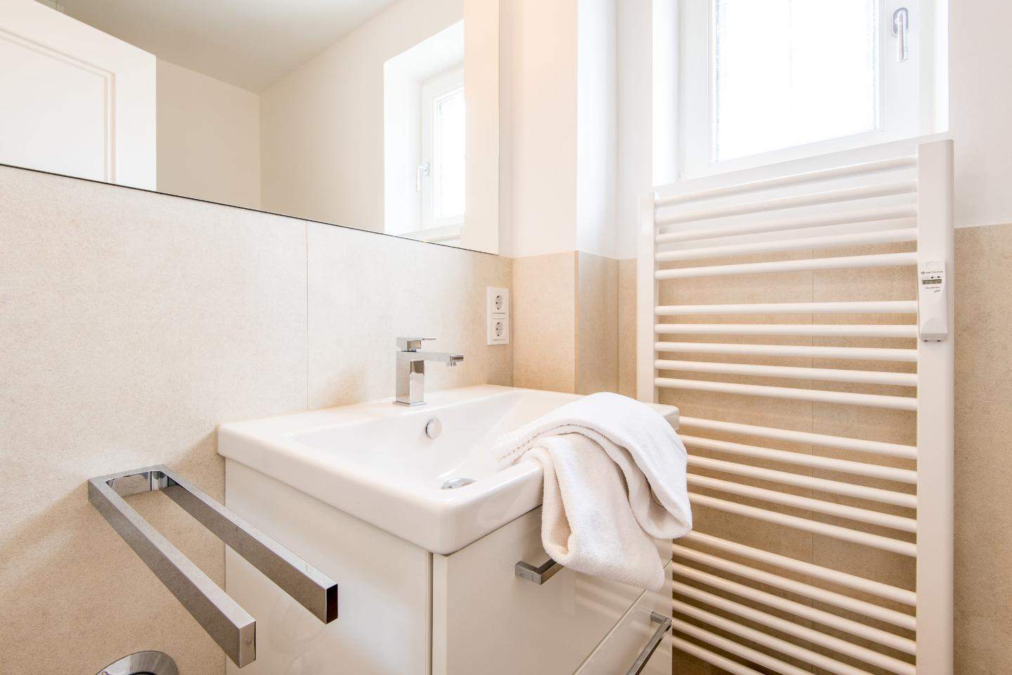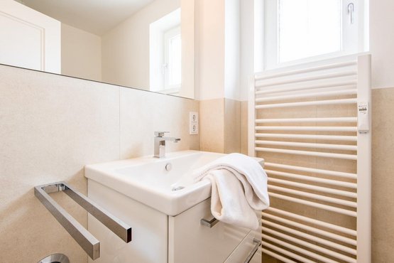 Badezimmer (Duschbad) mit Dusche, WC, Handtuchwärmer und Tageslicht.