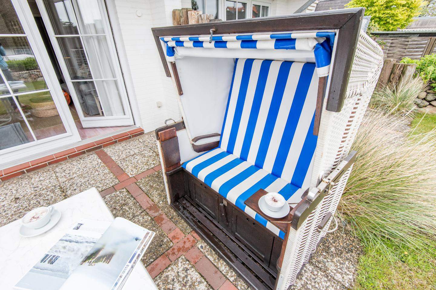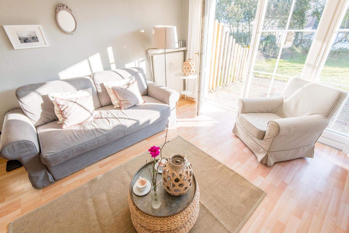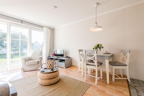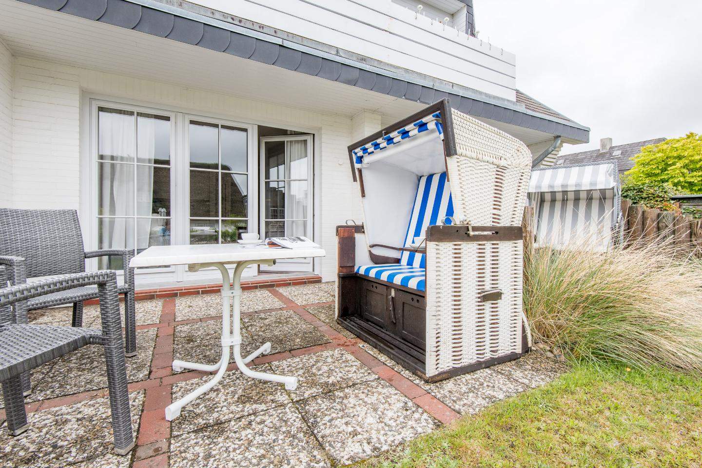 Sehr beliebt aufgrund seiner strandnahen Lage in Westerland auf Sylt. Nichtraucherwohnung. Haustiere willkommen. Wohnzimmer mit ausziehbarem (Schlaf-) Sofa (150x200cm), Sessel, TV und Esstisch mit 4 Stühlen. Direkter Zugang zur möblierten Gartenterrasse nach Süden mit Strandkorb.