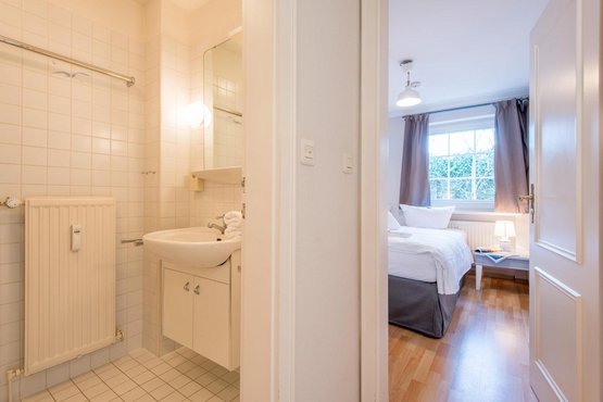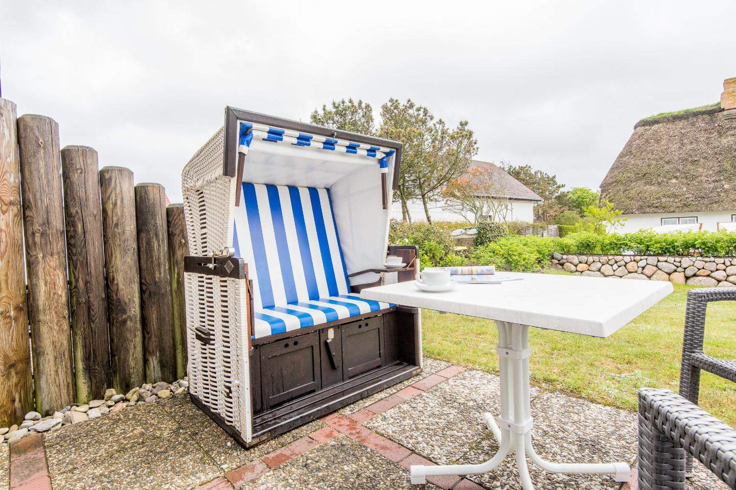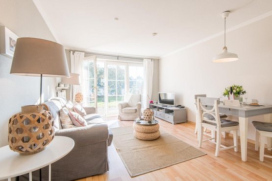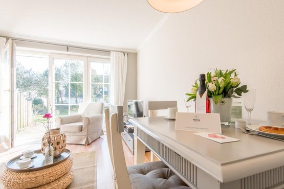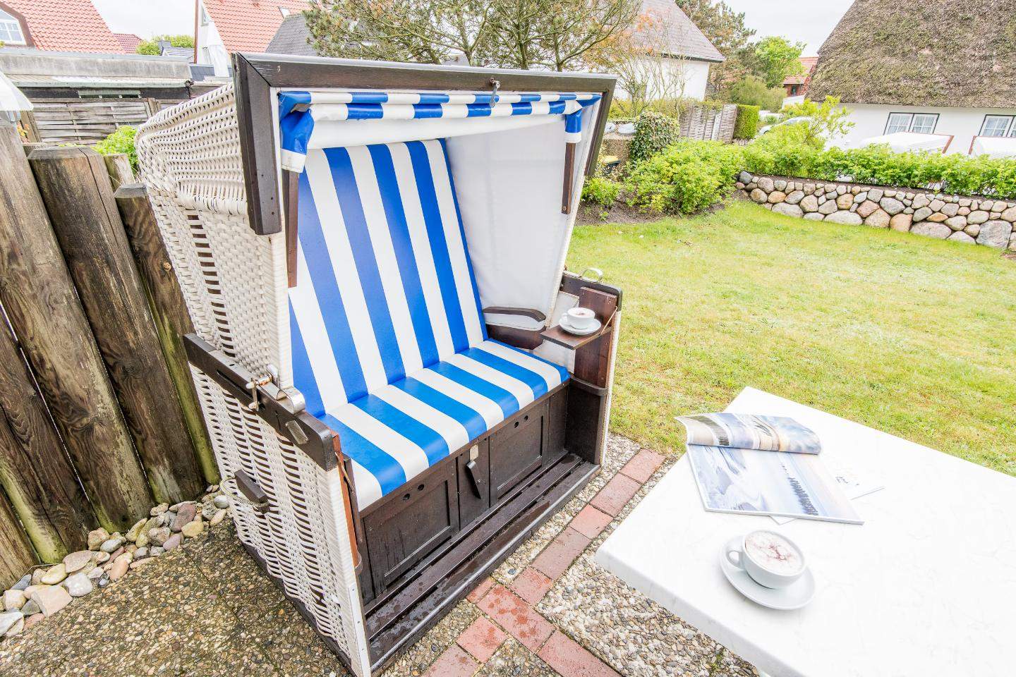 Sehr beliebt aufgrund seiner strandnahen Lage in Westerland auf Sylt. Nichtraucherwohnung. Haustiere willkommen. Wohnzimmer mit ausziehbarem (Schlaf-) Sofa (150x200cm), Sessel, TV und Esstisch mit 4 Stühlen. Direkter Zugang zur möblierten Gartenterrasse nach Süden mit Strandkorb.
