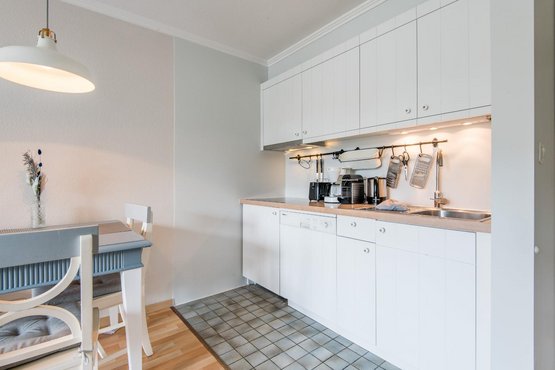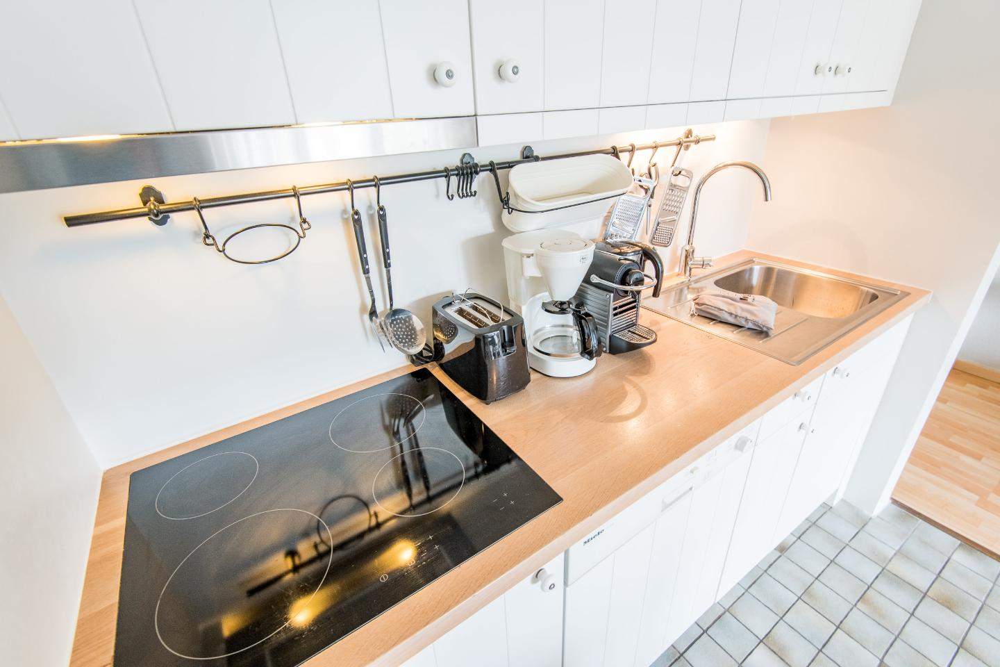 Offene Küche mit 4-flammigem Herd, Geschirrspüler, Filterkaffeemaschine und dem üblichen Komfort.