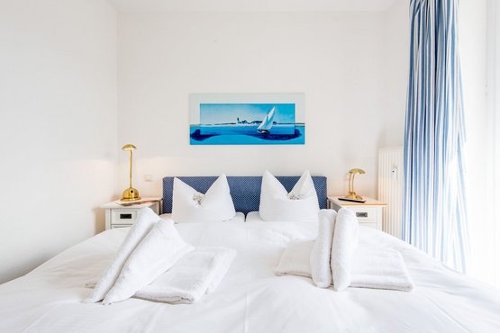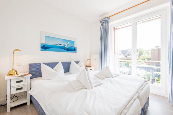 Schlafzimmer mit Doppelbett (2x 80x200cm), großem Kleiderschrank und direktem Zugang zum möblierten Balkon nach Osten.