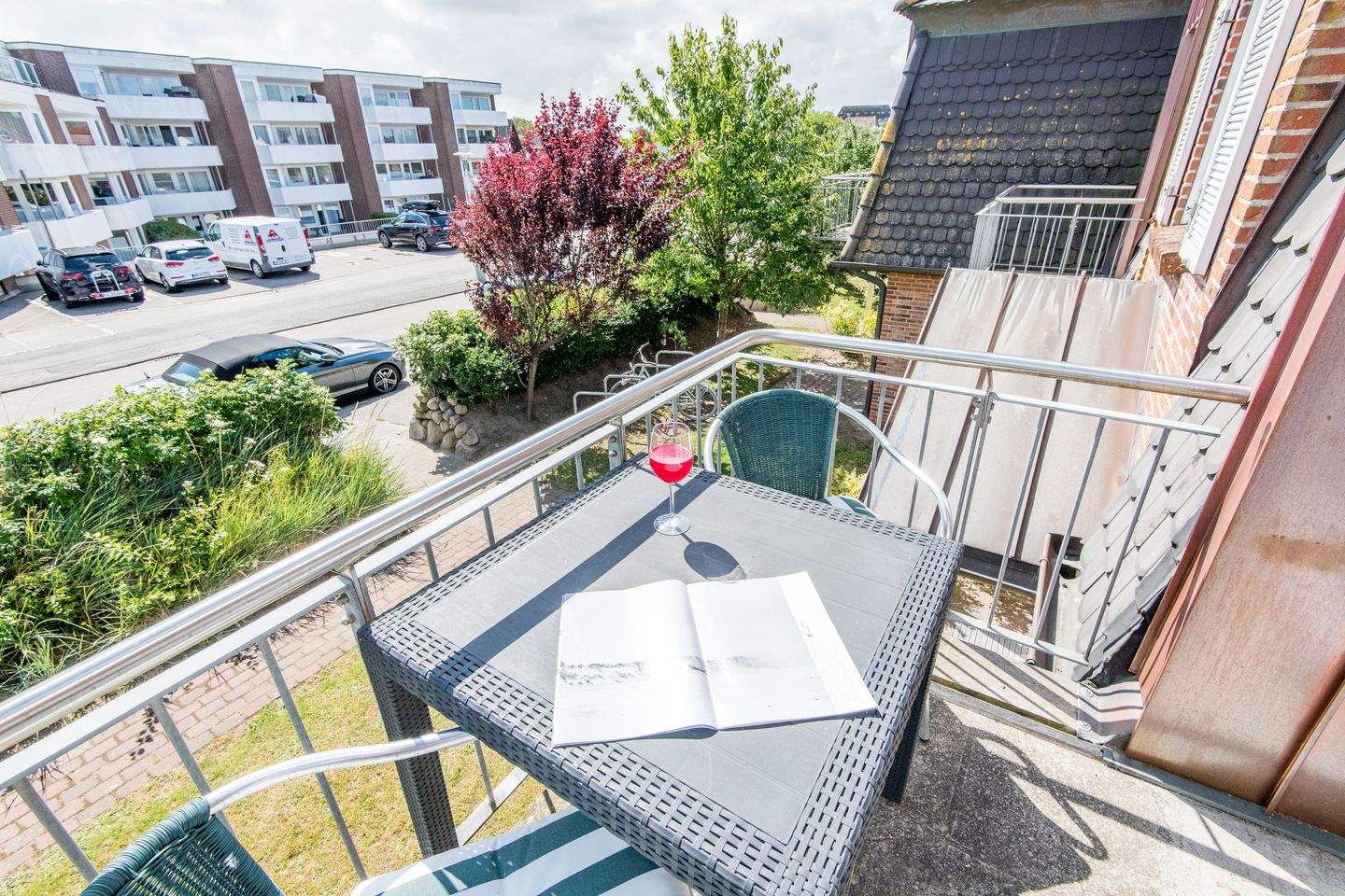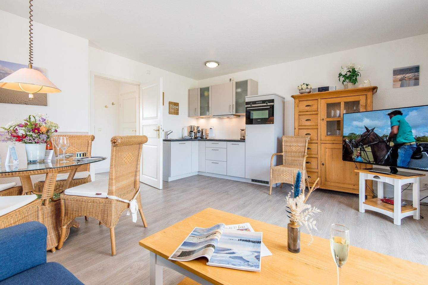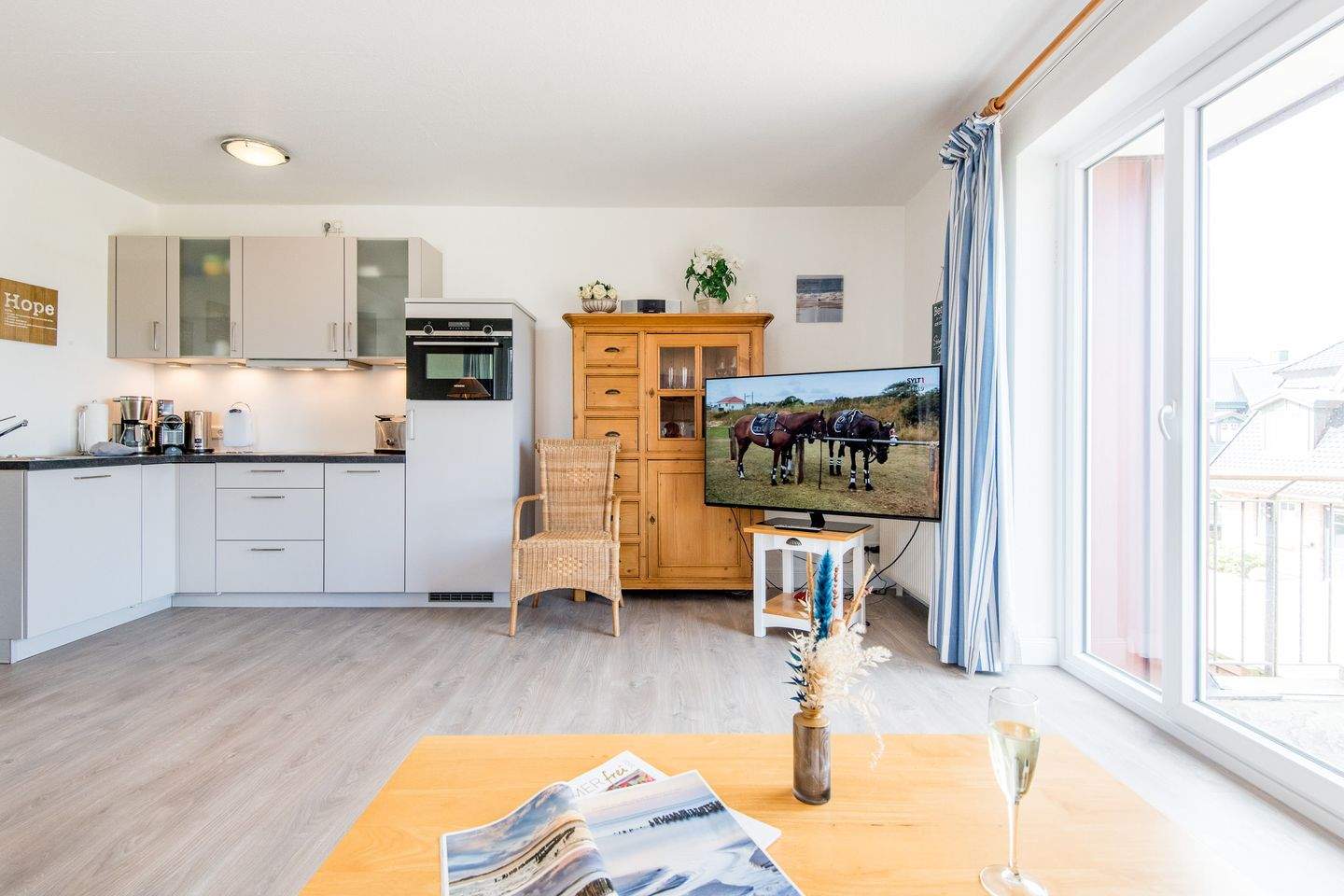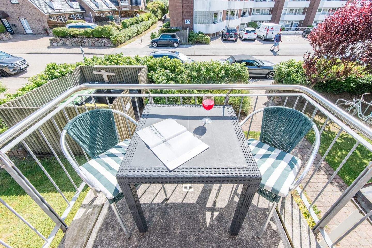 Sehr beliebt auf seiner strandnahen Lage in Westerland auf Sylt. Mit 2 Balkonen nach Westen und nach Osten. Nichtraucherwohnung. Wohnzimmer mit gemütlichem Lounge Sofa, Sessel, TV und Esstisch für 4 Personen. Direkter Zugang zum möblierten Balkon nach Westen.