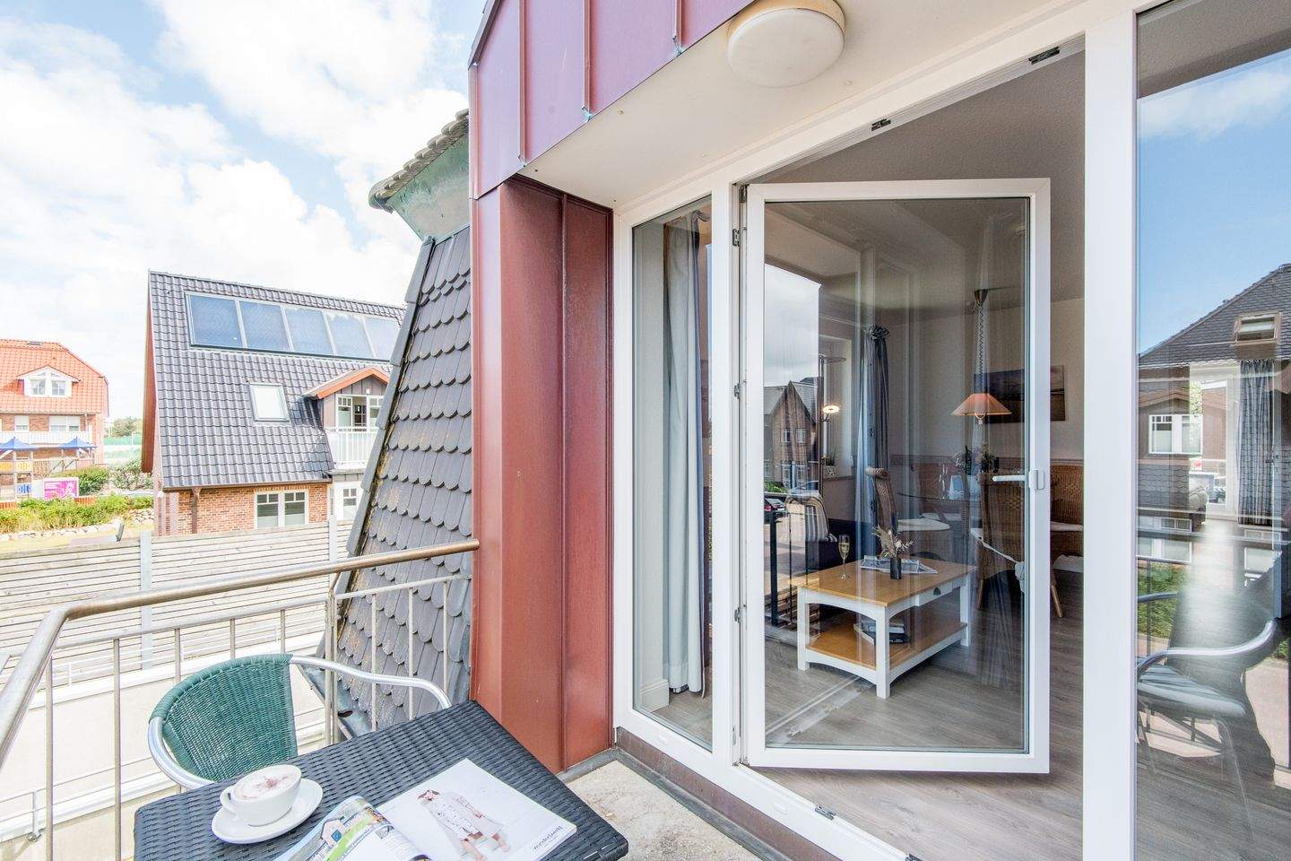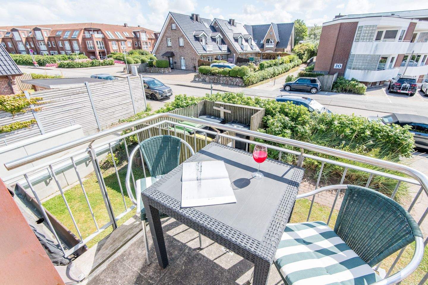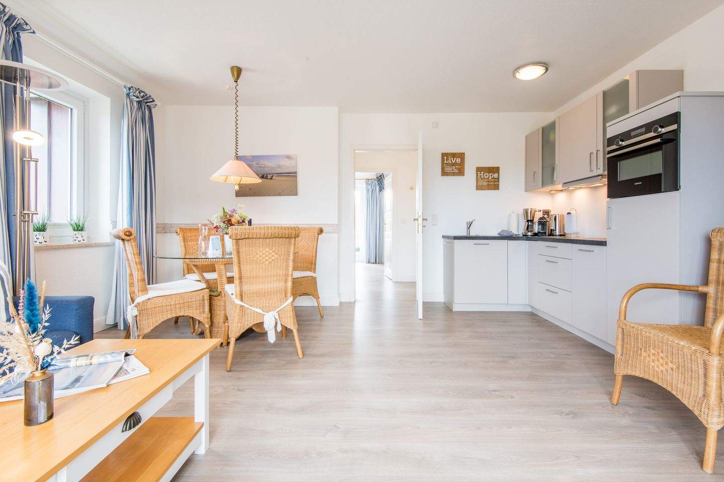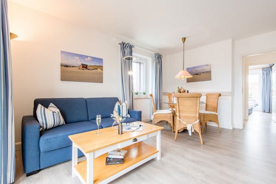 Sehr beliebt auf seiner strandnahen Lage in Westerland auf Sylt. Mit 2 Balkonen nach Westen und nach Osten. Nichtraucherwohnung. Wohnzimmer mit gemütlichem Lounge Sofa, Sessel, TV und Esstisch für 4 Personen. Direkter Zugang zum möblierten Balkon nach Westen.