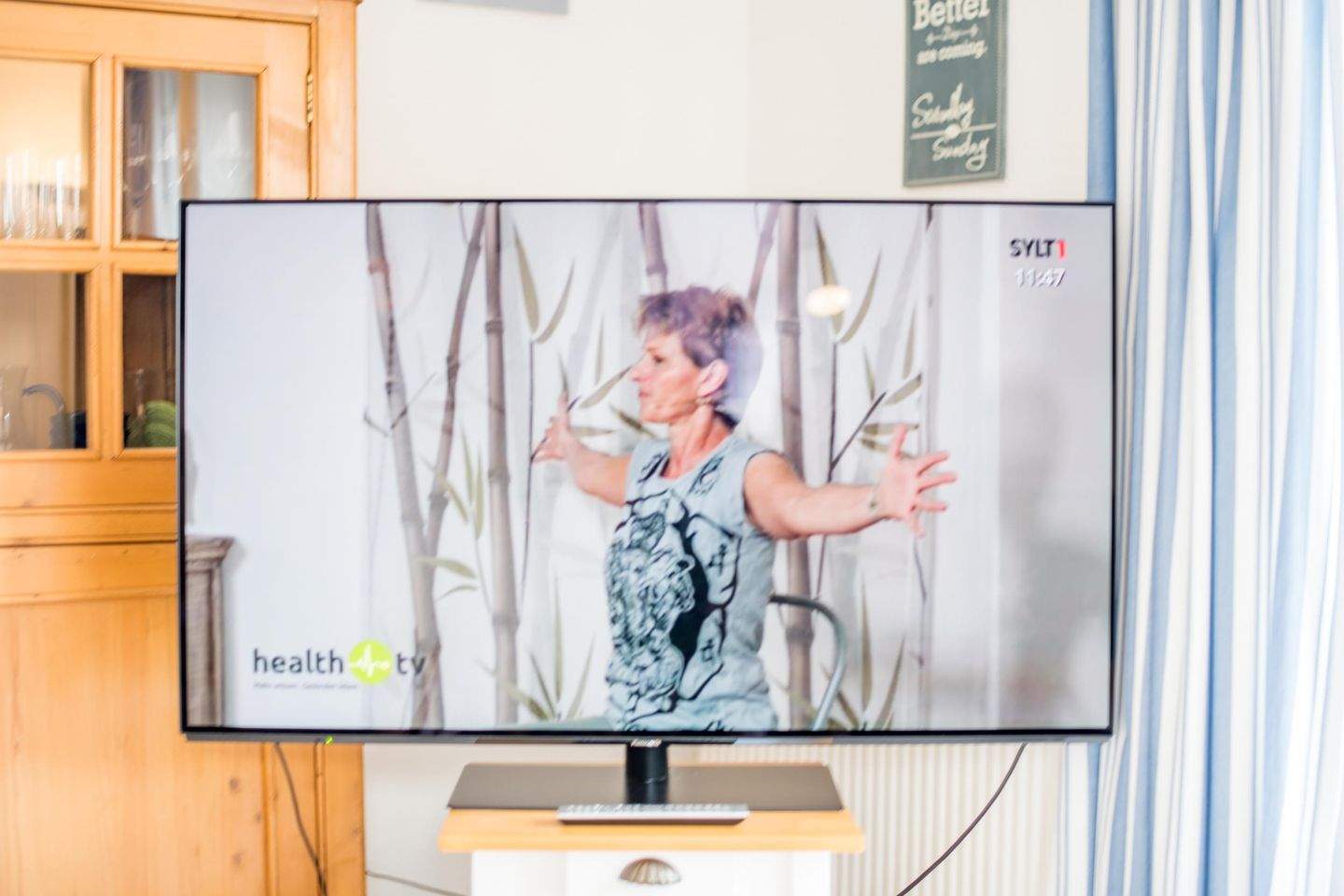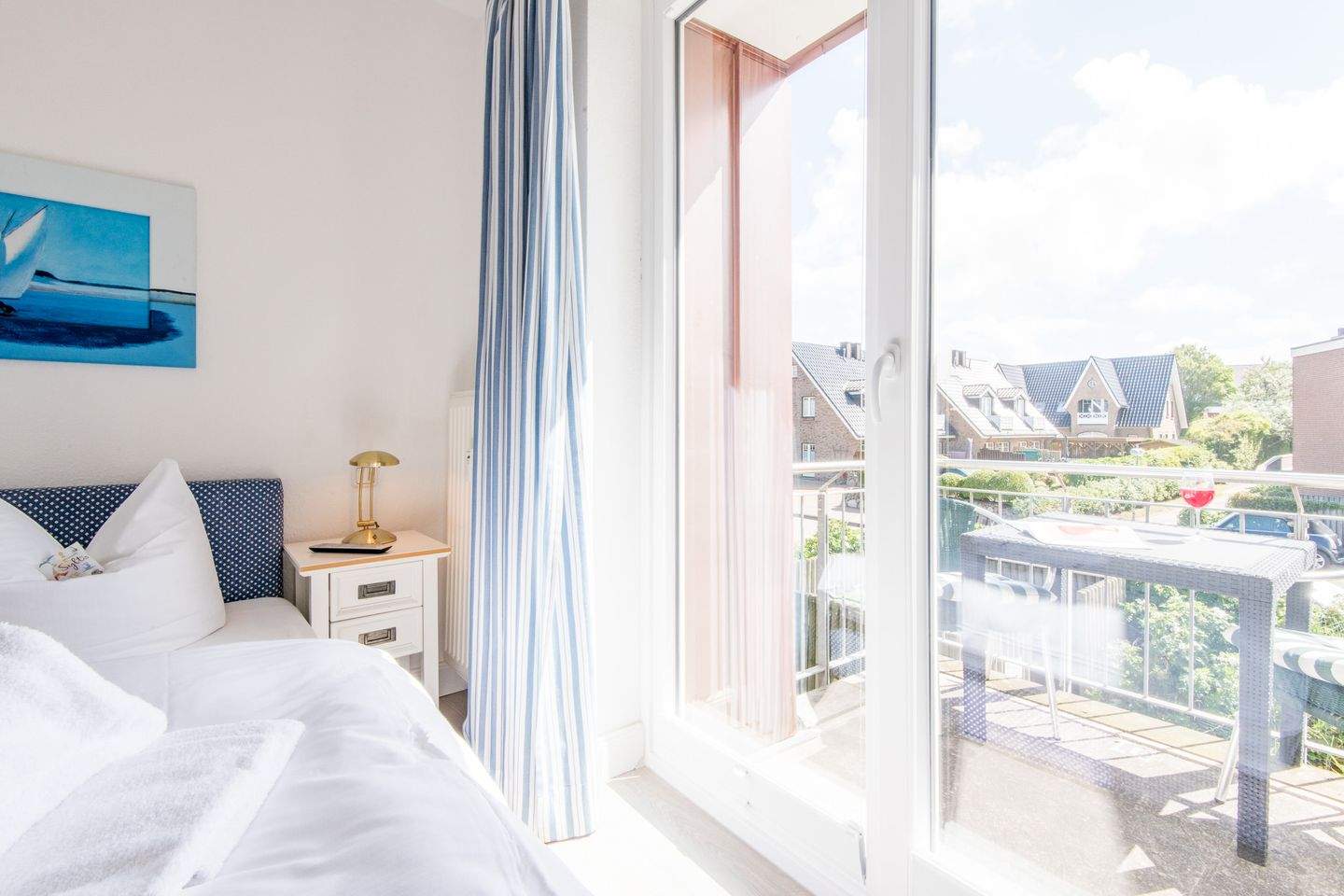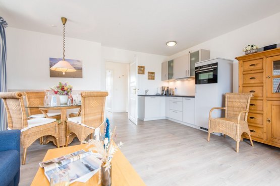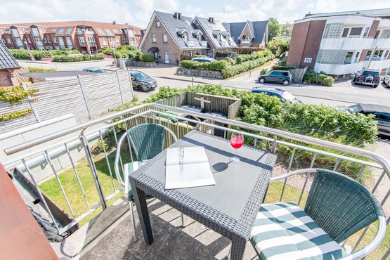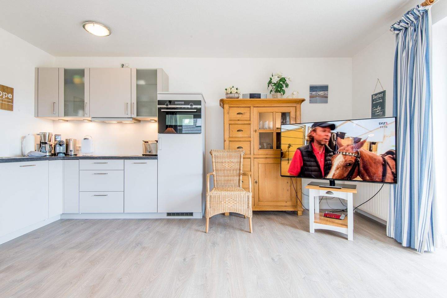 Sehr beliebt auf seiner strandnahen Lage in Westerland auf Sylt. Mit 2 Balkonen nach Westen und nach Osten. Nichtraucherwohnung. Wohnzimmer mit gemütlichem Lounge Sofa, Sessel, TV und Esstisch für 4 Personen. Direkter Zugang zum möblierten Balkon nach Westen.