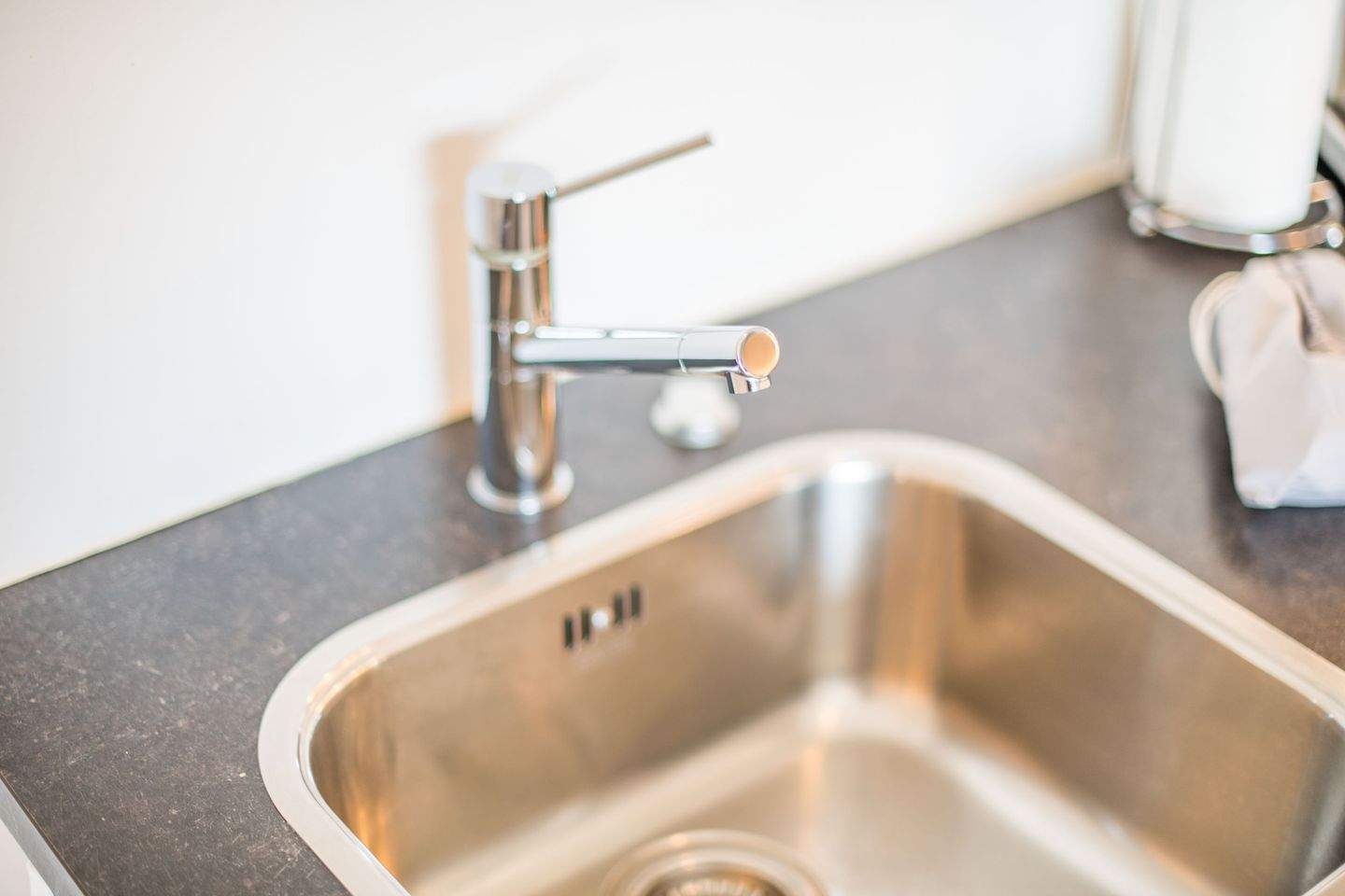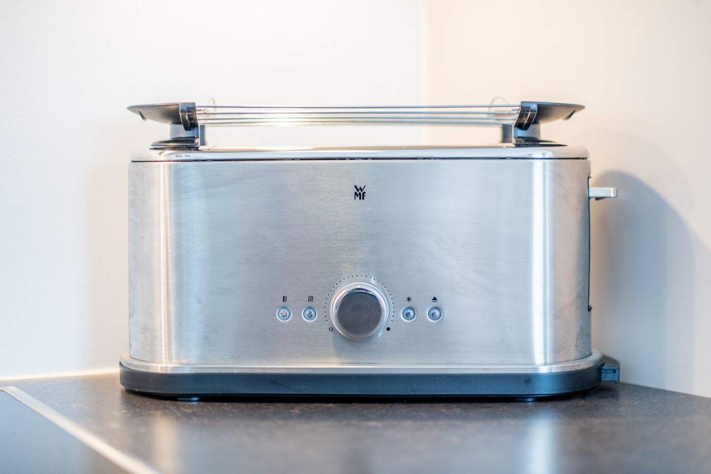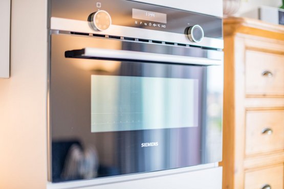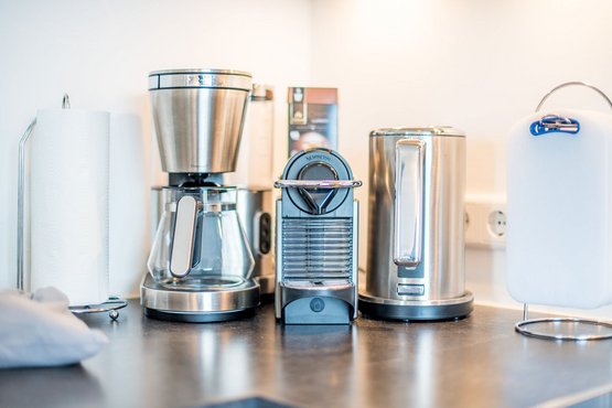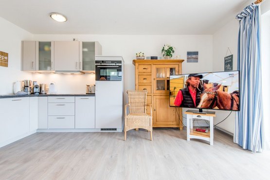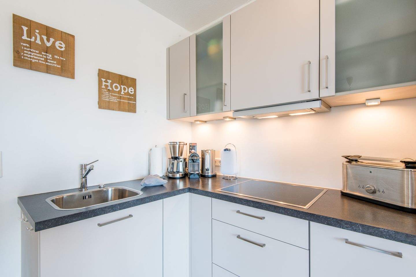 Moderne offene Küche mit 4-flammigem Ceran-Herd, Geschirrspüler, Filterkaffeemaschine und dem üblichen Komfort.