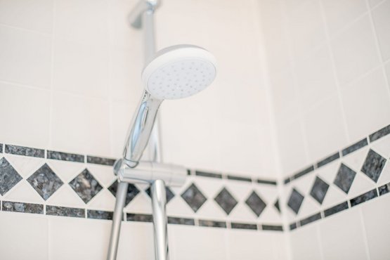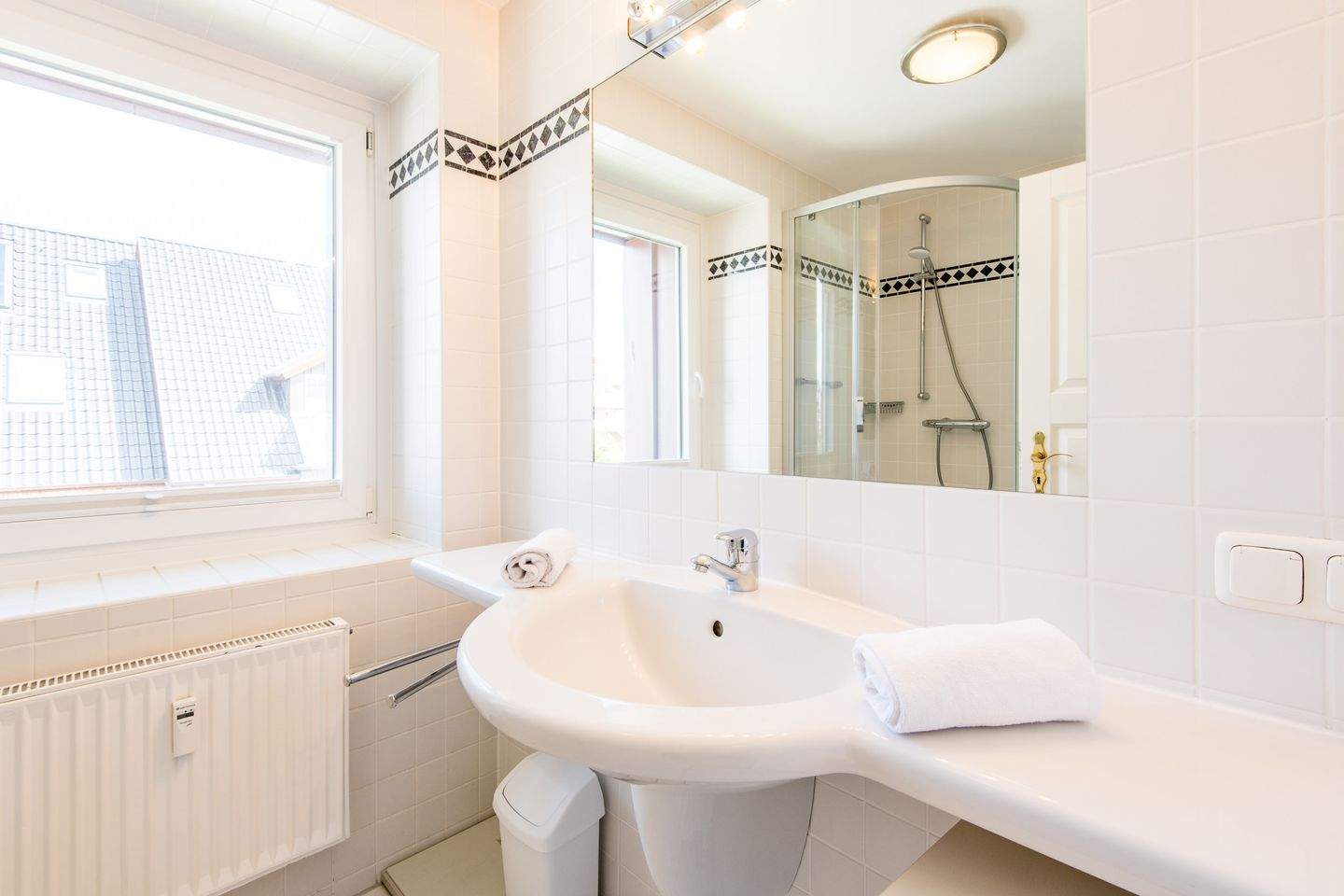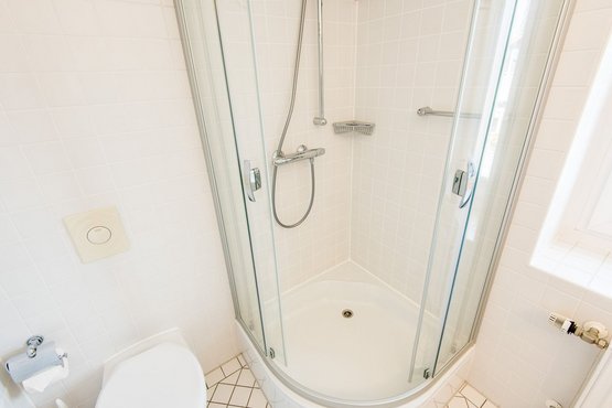 Helles Badezimmer (Duschbad) mit Dusche, WC, Föhn und Tageslicht.