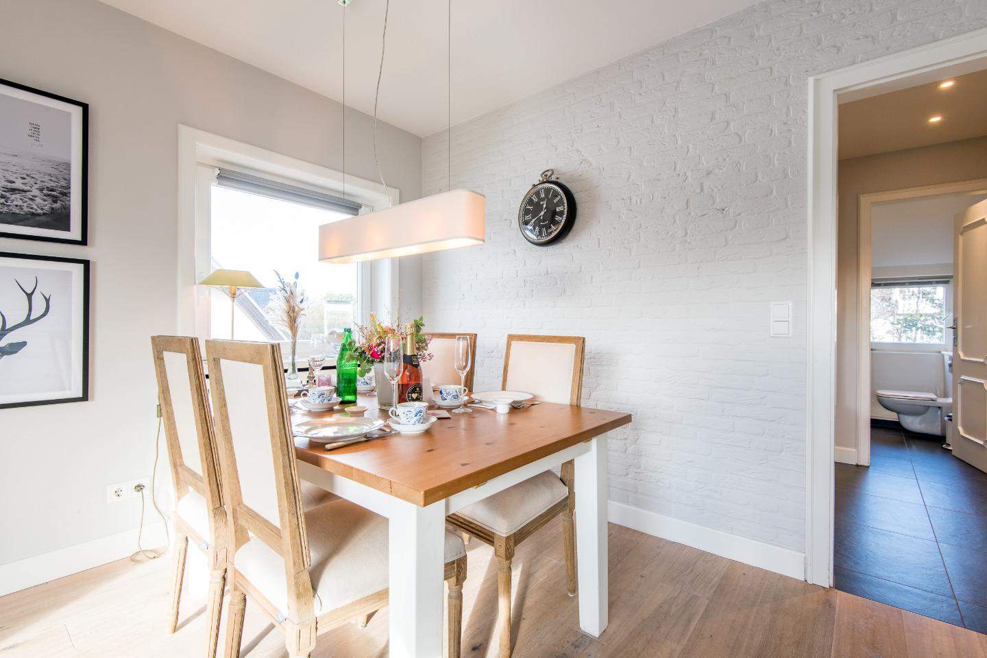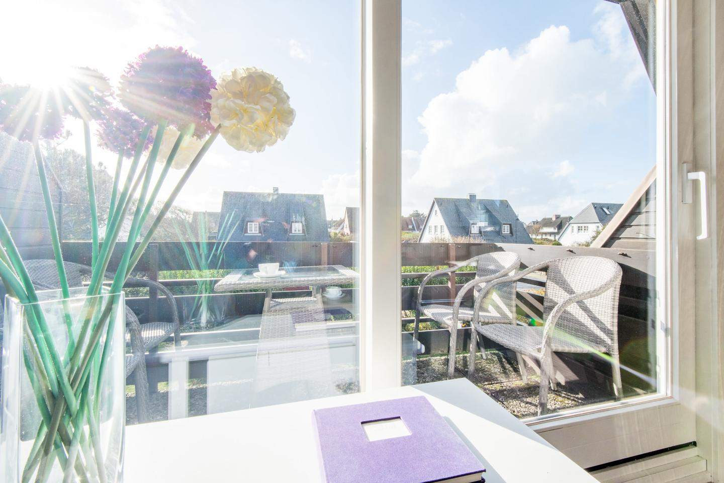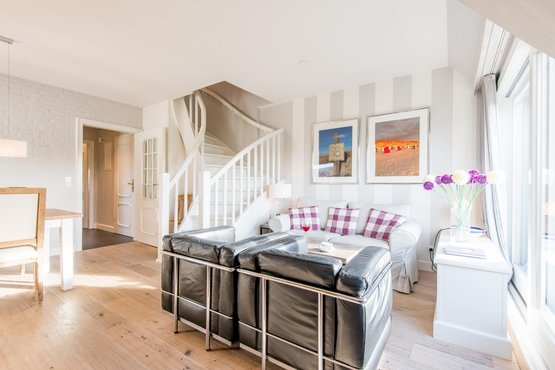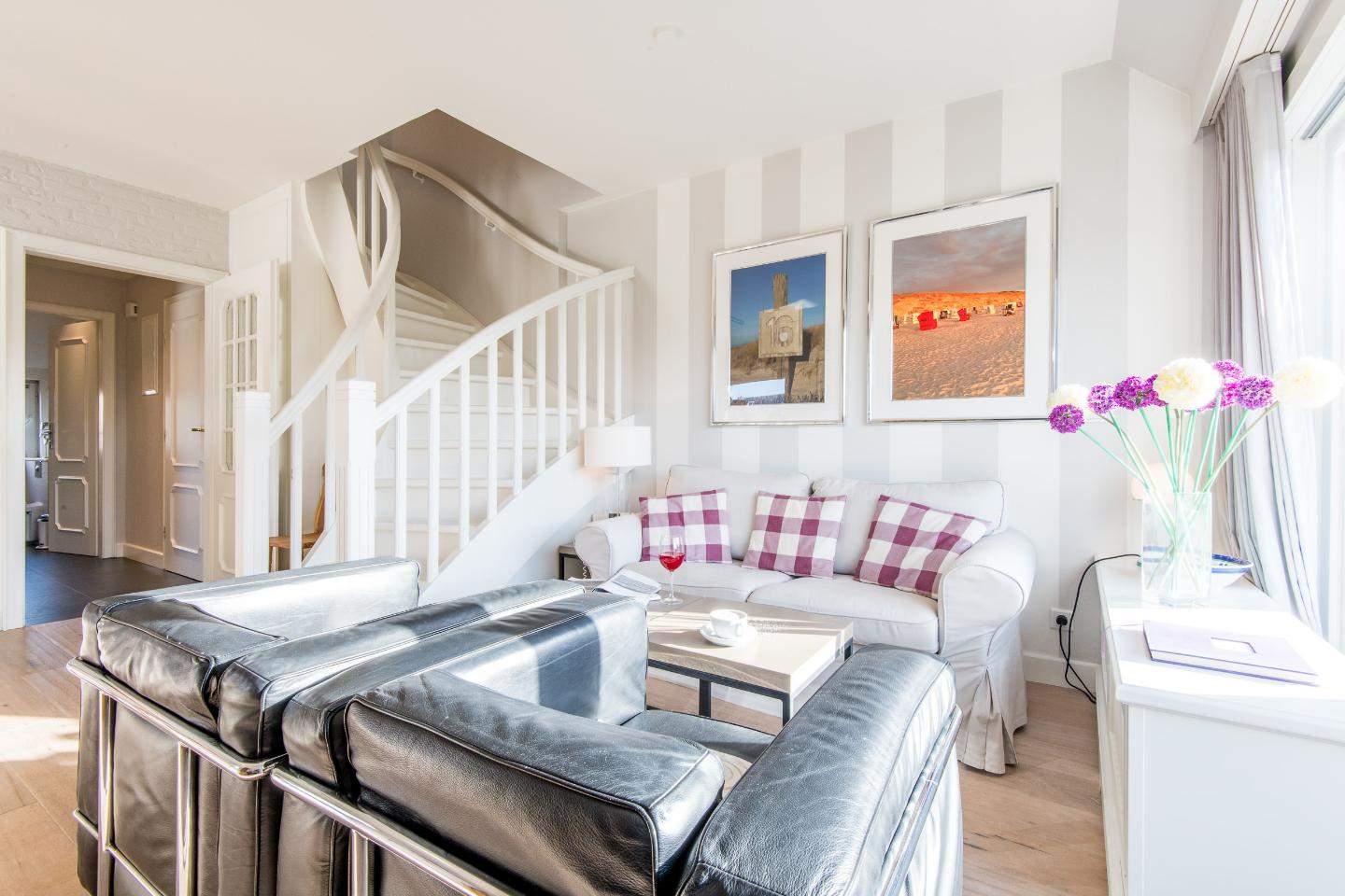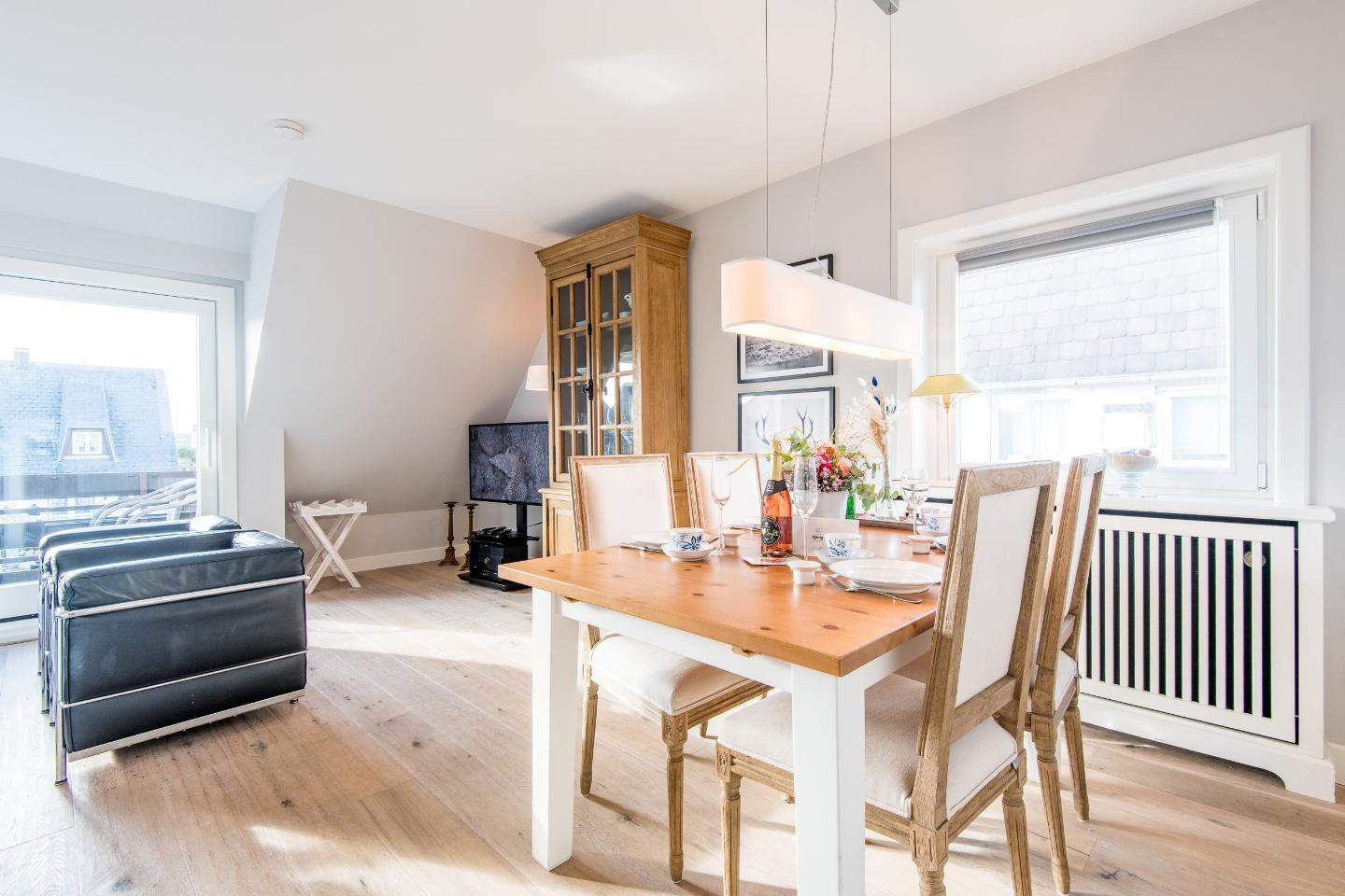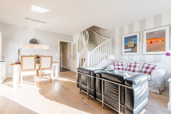 Lichtdurchflutete, moderne 3-Zimmer-Ferienwohnung mit ca. 58 m² auf 2 Ebenen (OG, DG) für bis zu 4 Personen. Strandnahe Lage in Wenningstedt auf Sylt, ideal für einen erholsamen Strandurlaub. Hochwertige Tischlereinbauten, Fenster in allen Räumen und helles Eichenparkett verbunden mit dem sonnigen Balkon zum Süd-Westen macht diese Wohnung besonders. Nichtraucherwohnung. Helles Wohnzimmer mit gemütlichem Sofa, 2 Sessel, Esstisch für 4 Personen, TV, Blu-ray-Recorder, Stereo-Anlage und direktem Zugang zum möblierten Balkon nach Südwest.