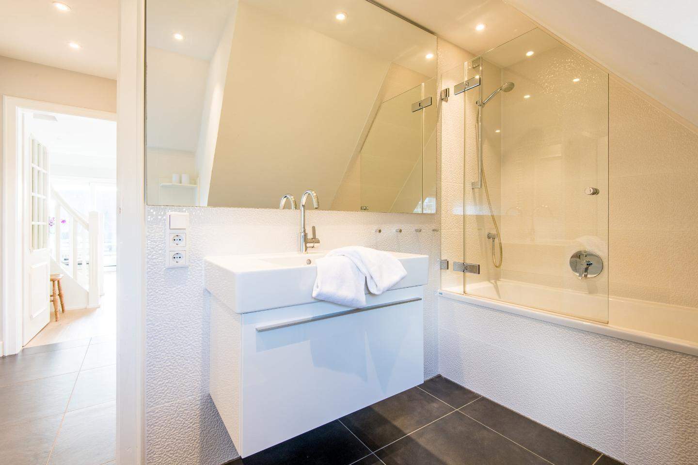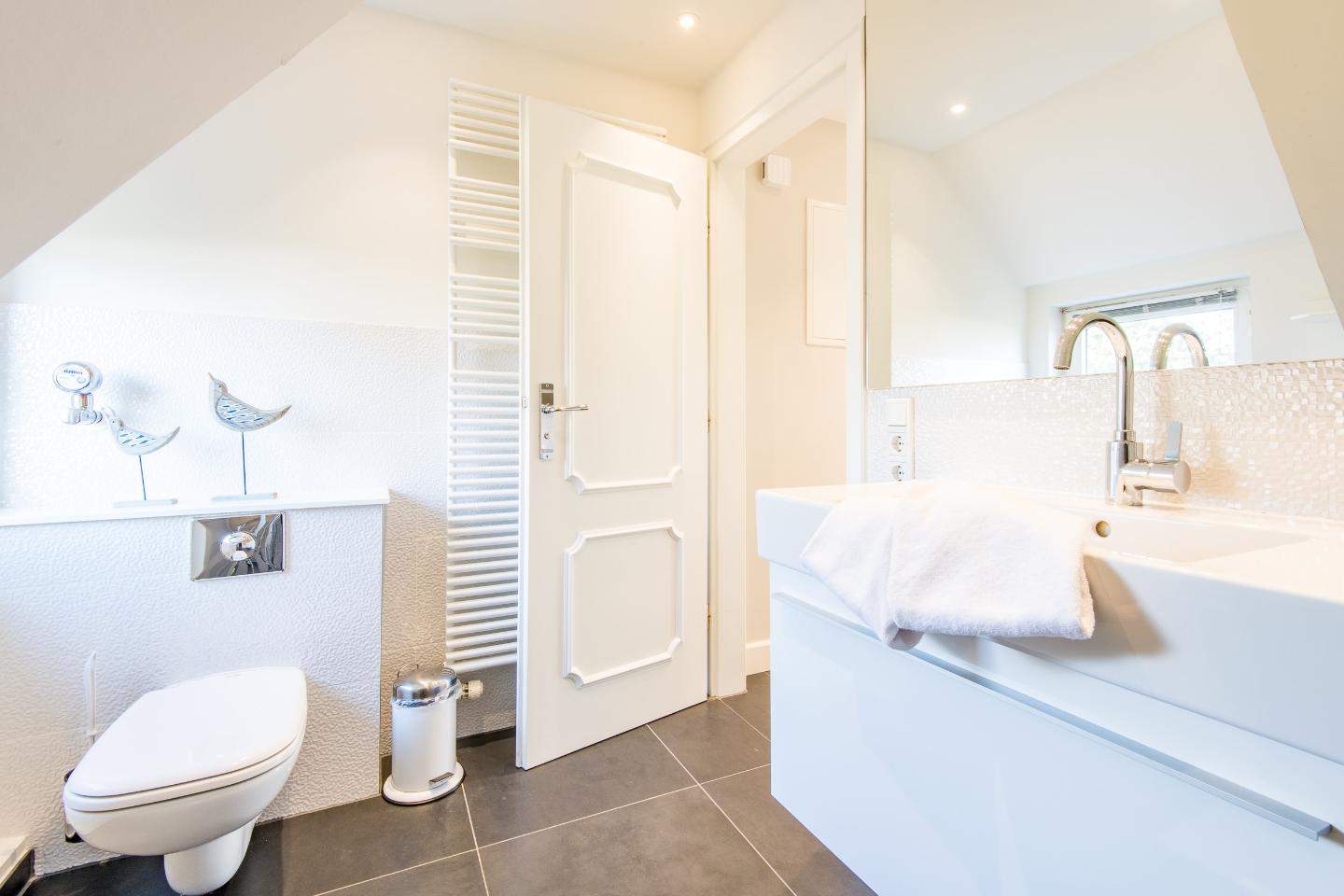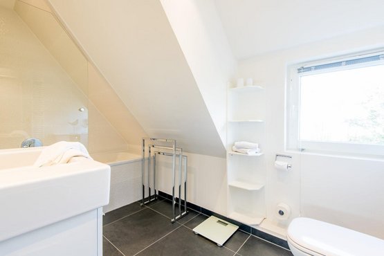 Modernes Badezimmer (Vollbad) mit Badewanne, Duschmöglichkeit, WC, Föhn und Handtuchwärmer.