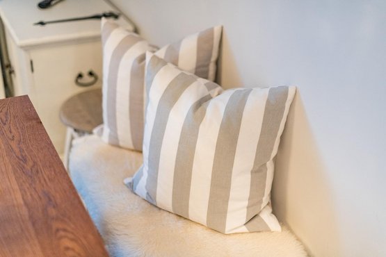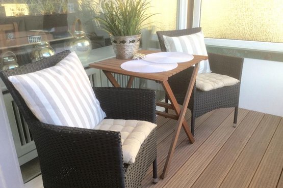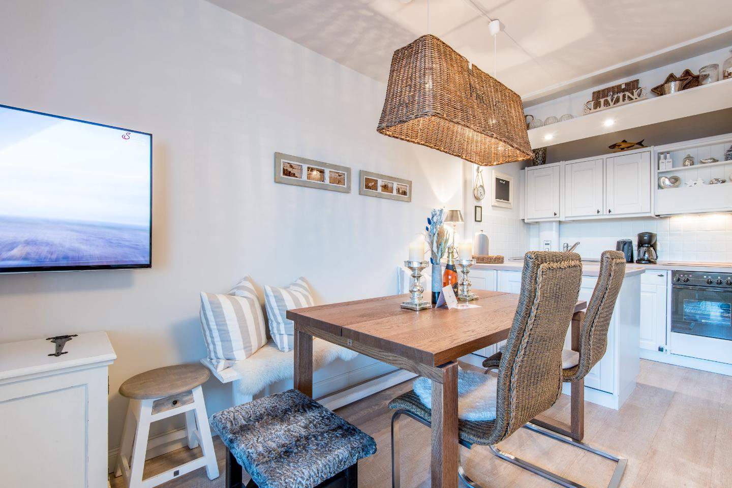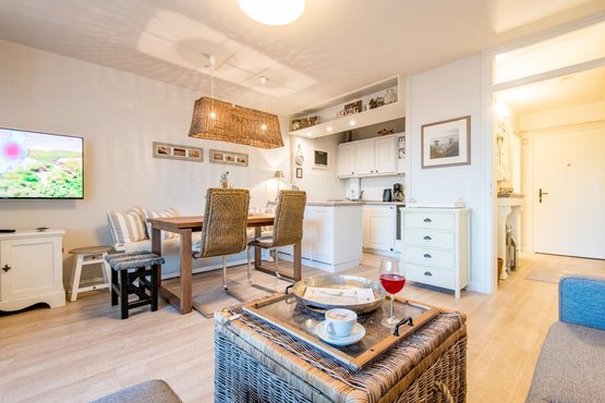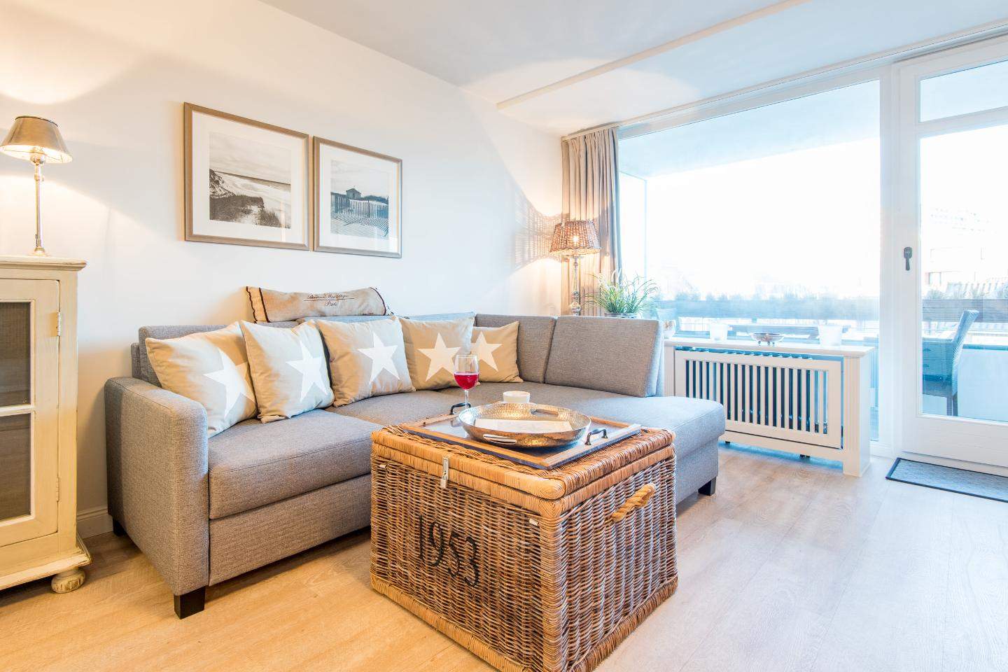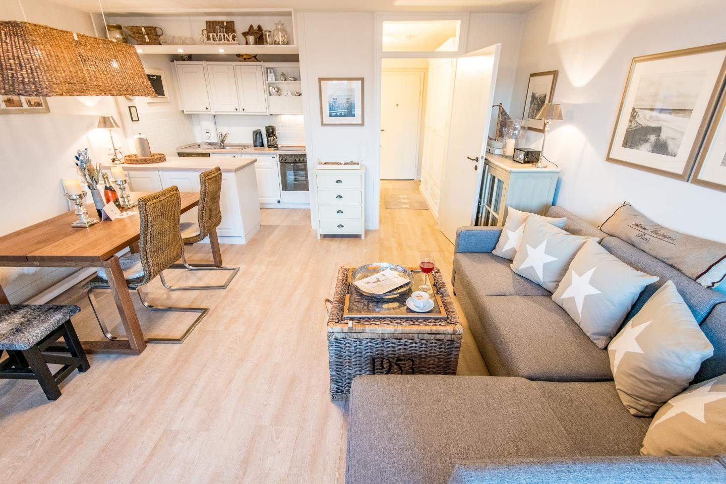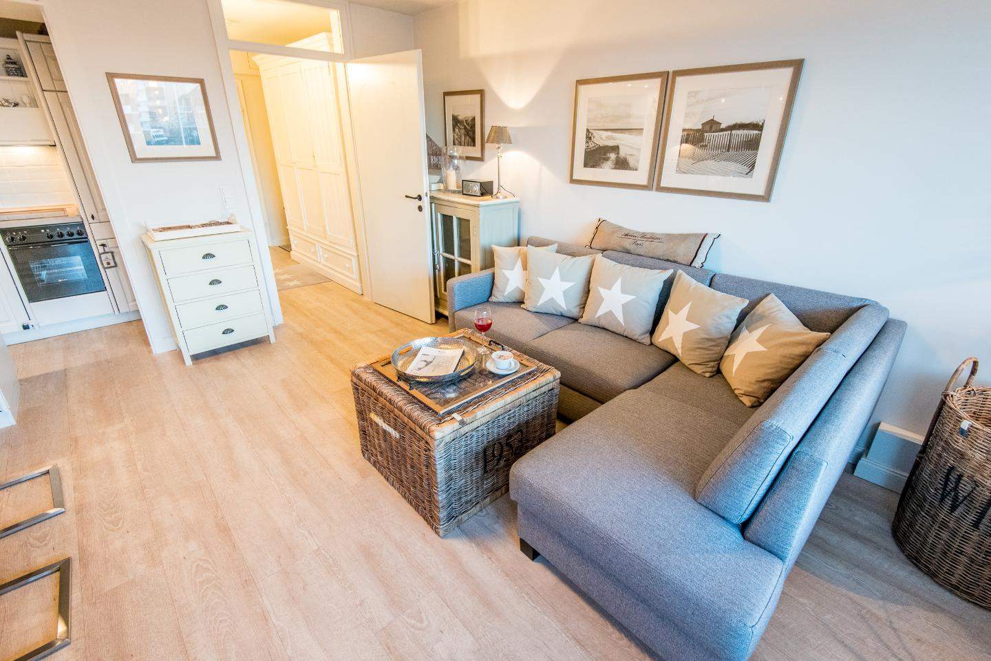 Strandnahe, exklusive 2-Zimmer-Ferienwohnung 'Peter' im Flamant-Stil (Riviera Maison) mit ca. 45 m² auf 1 Ebene (2. Etage) für bis zu 2 Personen. Äußerst strandnahe Lage in Westerland auf Sylt. Die Fußgängerzone Friedrichstraße befindet sich in direkter Nähe. Nichtraucherwohnung und allergikerfreundlich. Wohnzimmer mit Sofa, Sessel, Esstisch für 4 Personen und TV. Direkter Zugang zum möblierten Balkon nach Norden.
