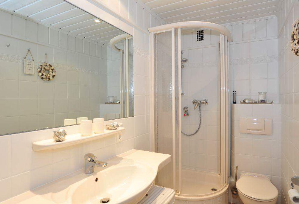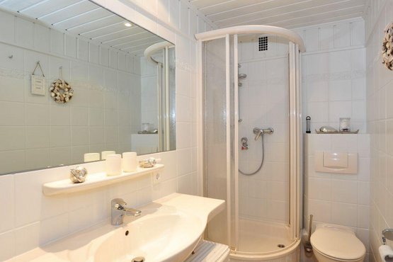 Badezimmer (Duschbad) mit Dusche, WC, Handtuchwärmer und Föhn.