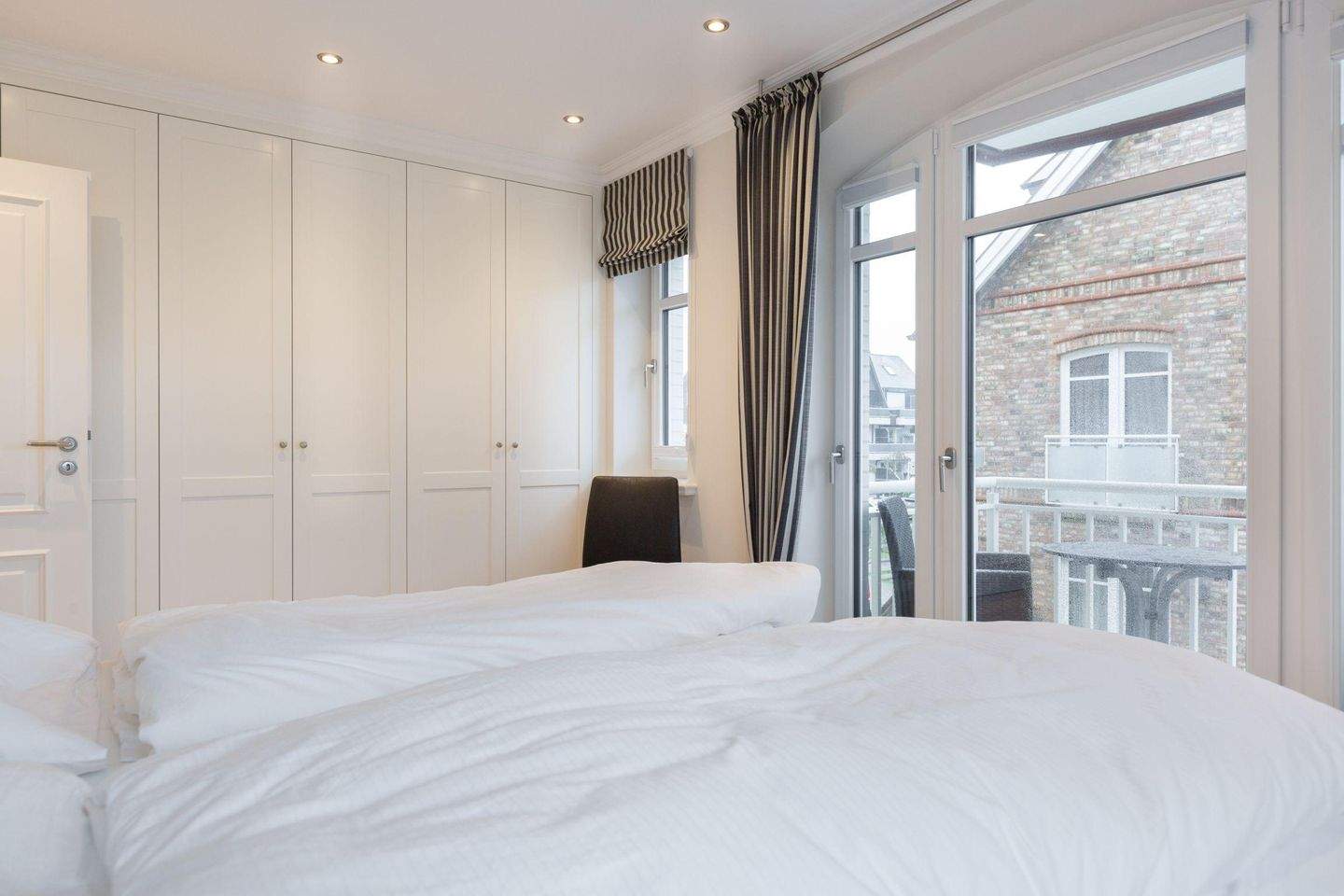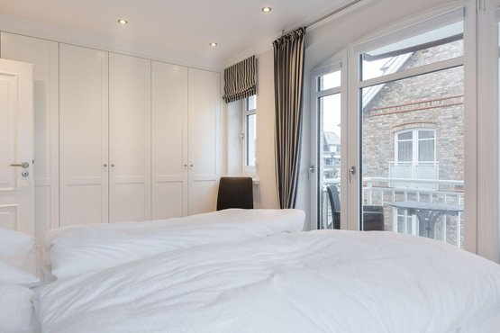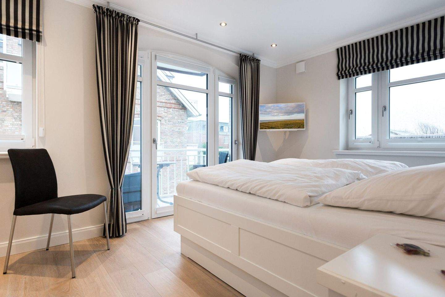 Schlafzimmer mit Doppelbett (2 x 90x200cm), Einbauschrank, TV und direktem Zugang zum möblierten Balkon nach Osten.