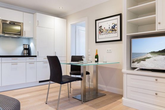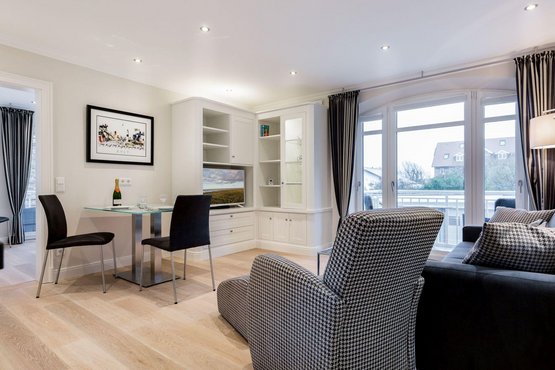 Das Domizil überzeugt durch die zentral und dennoch ruhige Lage und verfügt über 2 Balkone nach Süden und Osten. Die besondere Architektur entspricht höchsten Ansprüchen und schafft eine Wohlfühlatmosphäre. Eine gemeinschaftliche Sauna, Dampfbad und Schwalldusche stehen gratis für Sie zur Verfügung. Nichtraucherwohnung. Haustiere nicht gestattet. Helles, komfortables Wohnzimmer mit Sofa, Sessel, Esstisch für 2 Personen, TV und einem direkten Zugang zum möblierten Balkon nach Süden.