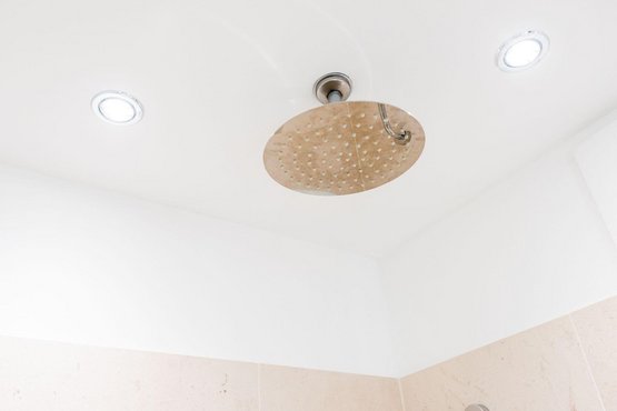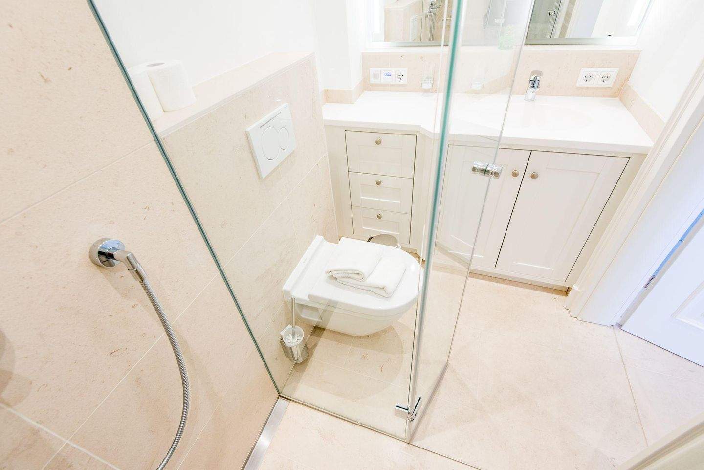 Badezimmer (Duschbad) mit ebenerdiger Dusche, WC, Handtuchwärmer und Föhn.