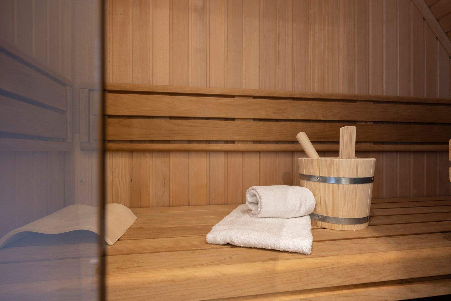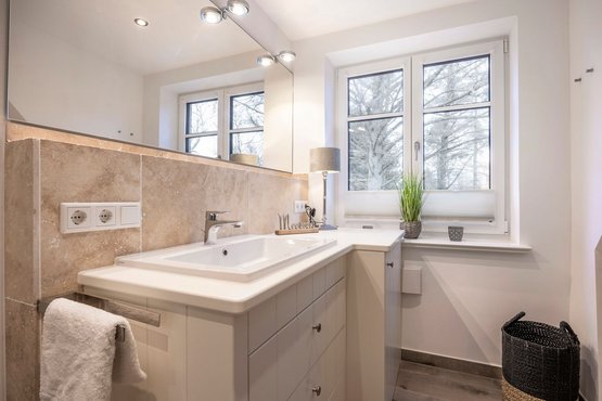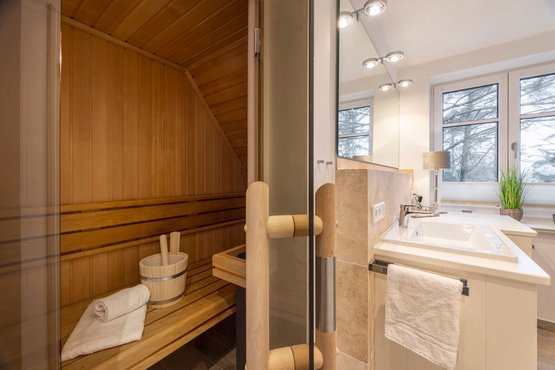 1. Badezimmer (Duschbad) mit ebenerdiger Dusche, WC, Sauna, Waschtrockner, Handtuchwärmer, Föhn, Tageslicht.
