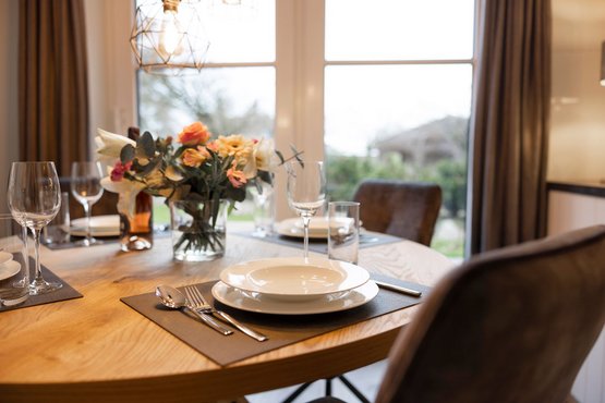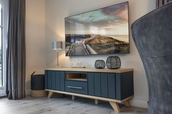 Wohnzimmer mit großem Esstisch mit 4 Stühlen, gemütlicher Sofaecke, großem TV und direktem Zugang zur möblierten Gartenterrasse nach Süden und Westen.