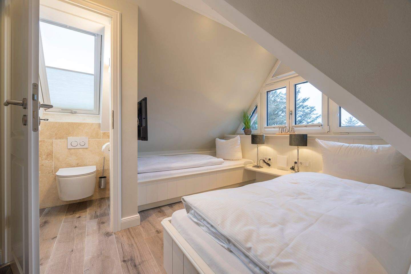 2. Schlafzimmer mit 2 Einzelbetten (je 90x200cm), Einbauschrank und TV. En Suite mit WC und kleinem Waschbecken.