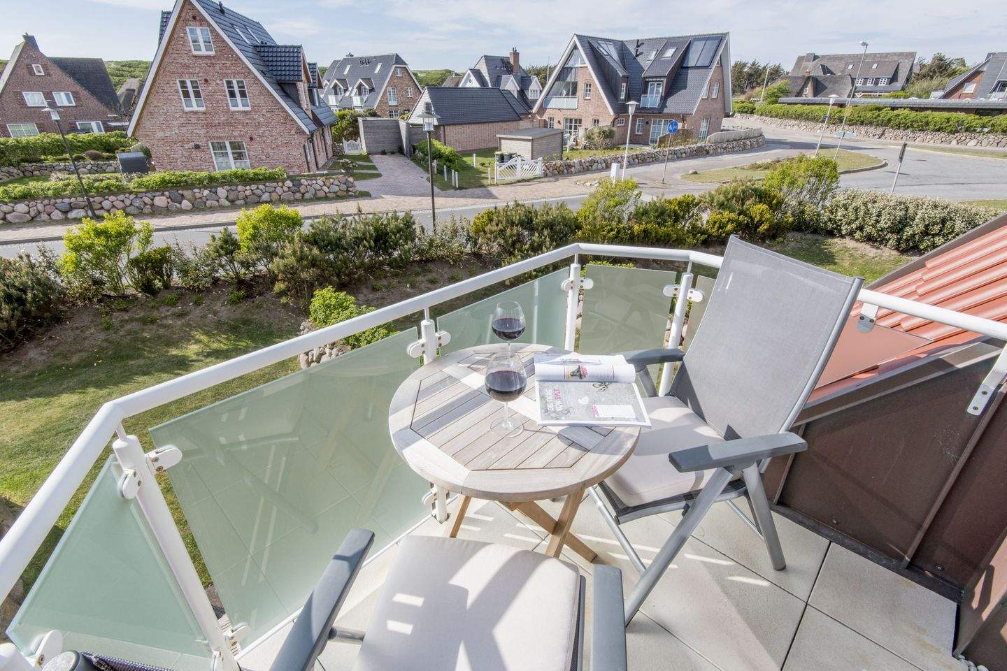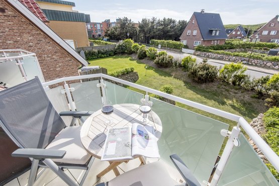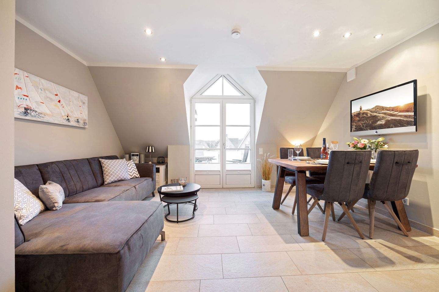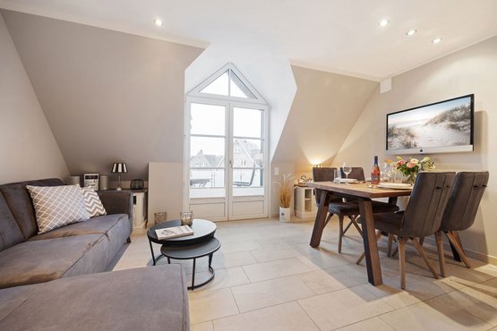 In Hörweite der Brandung. Rauchen nicht gestattet. Wohnzimmer mit großem Ecksofa, Esstisch mit 4 Stühlen und TV. Direkter Zugang zum möblierten Balkon nach Westen für 2 Personen, mit kleinem Dünenblick.