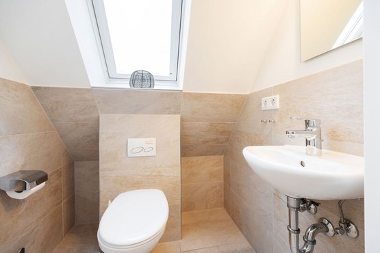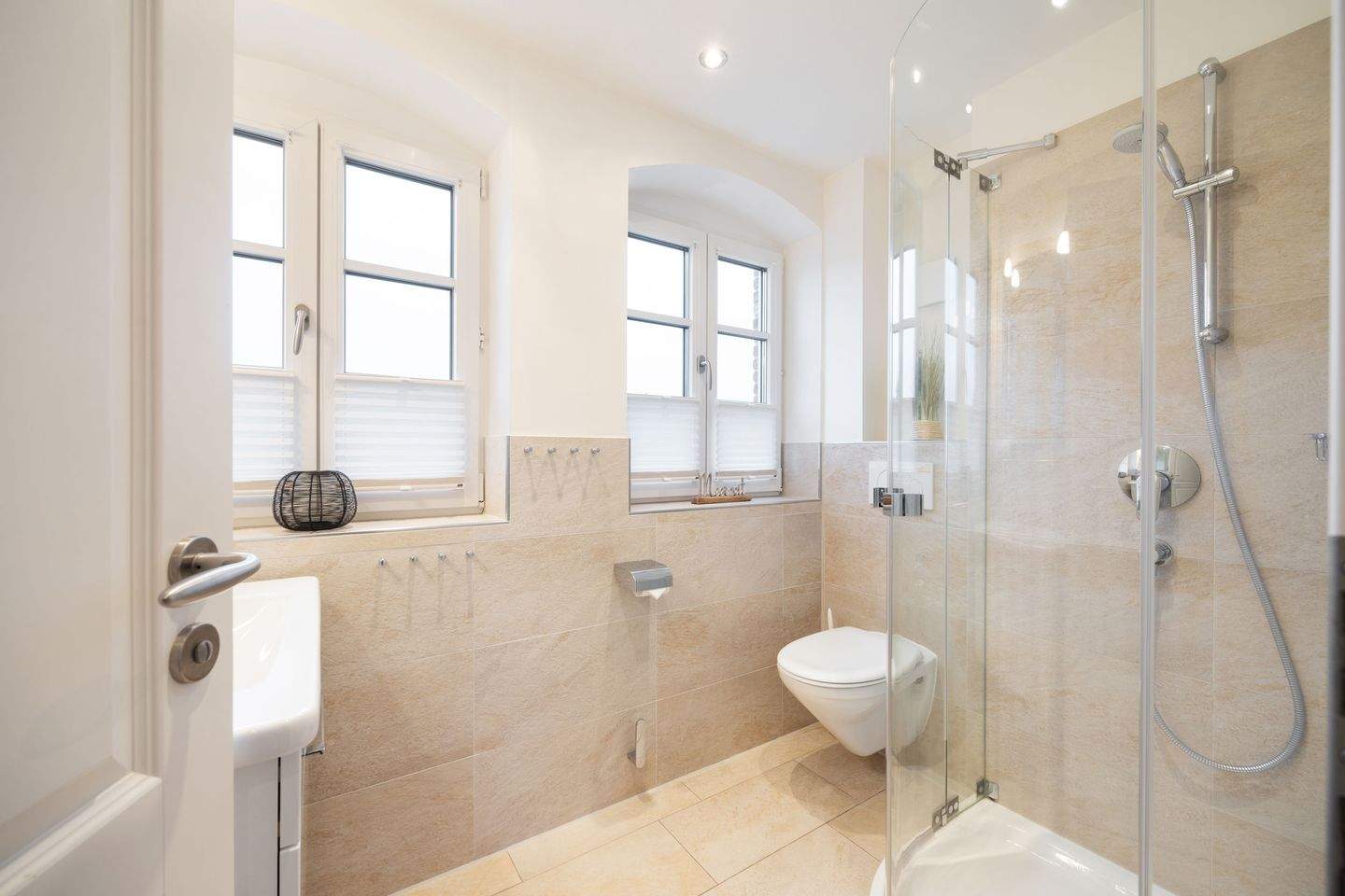 Badezimmer (Duschbad) mit Dusche, WC, Handtuchwärmer, Föhn und Tageslicht.