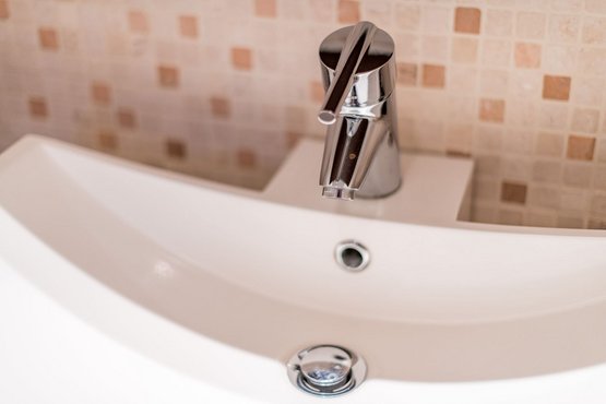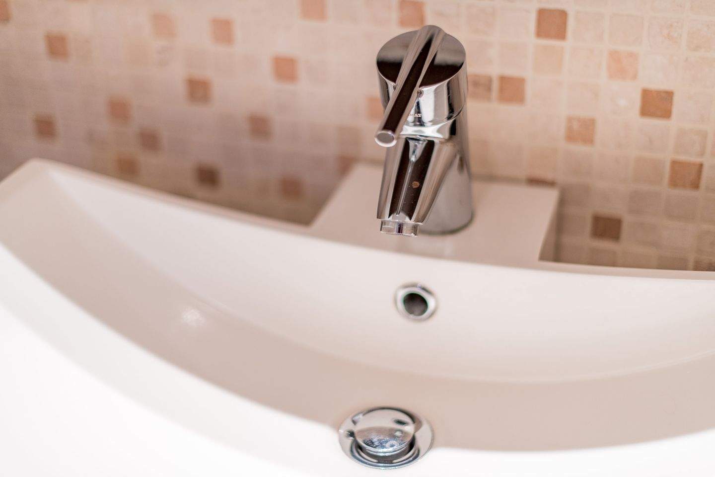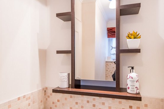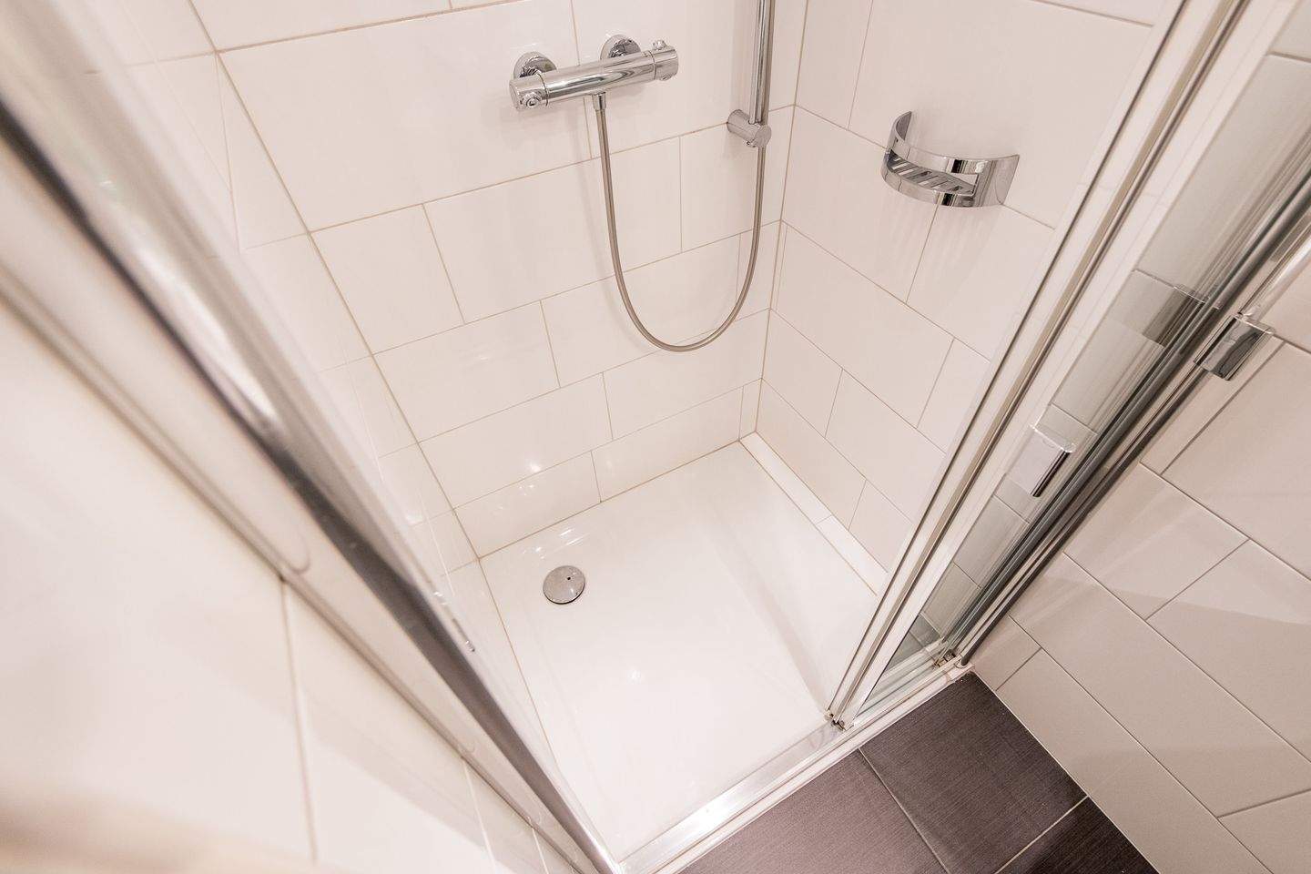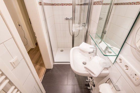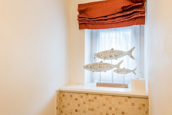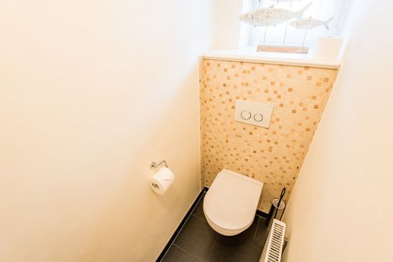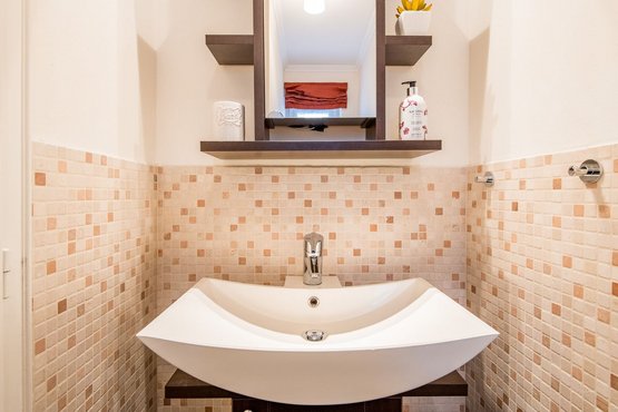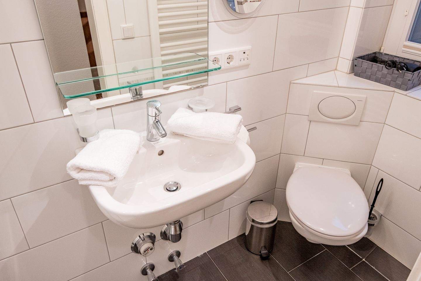 Badezimmer (Duschbad) mit Dusche, WC, Föhn und Tageslicht. Gäste-WC.