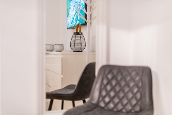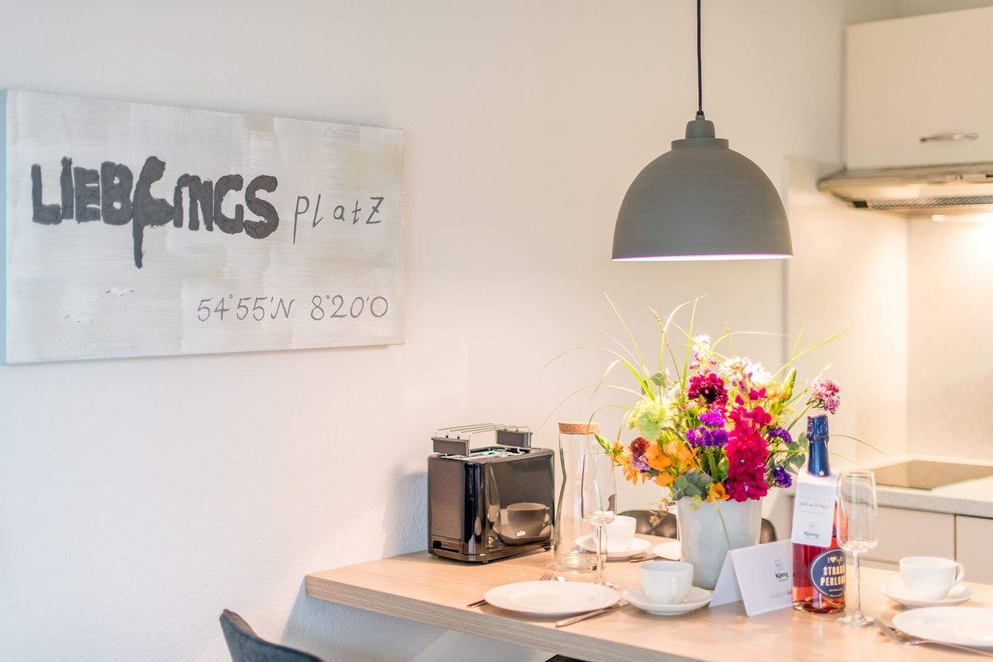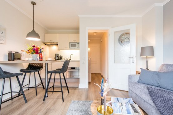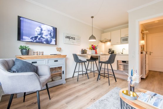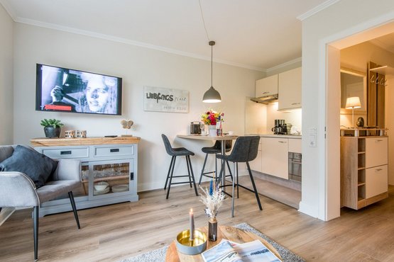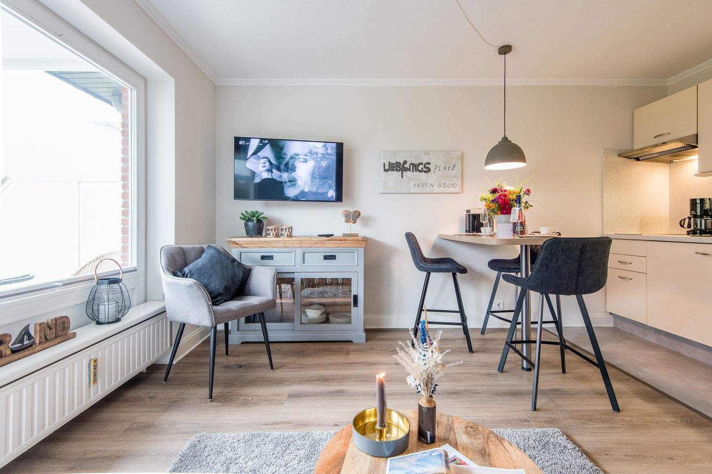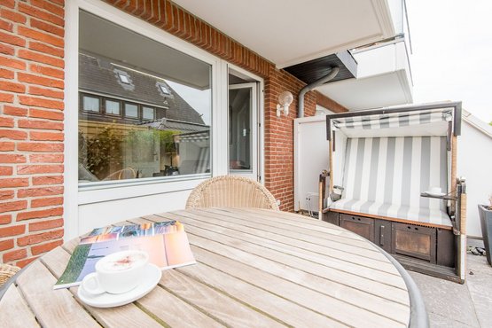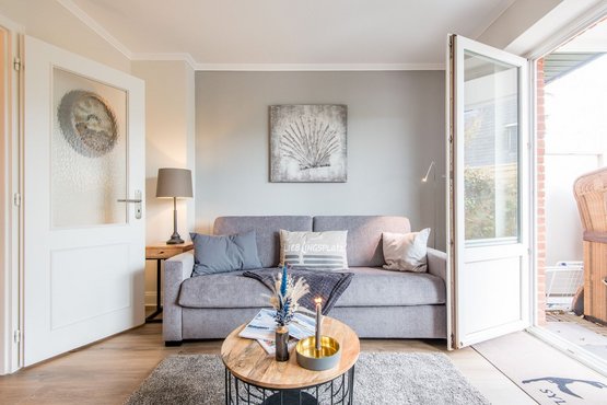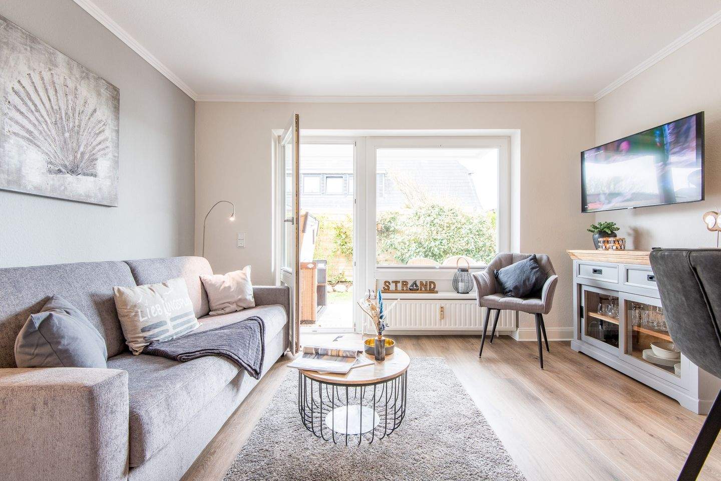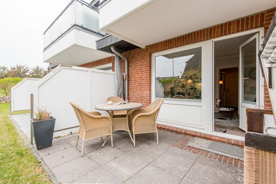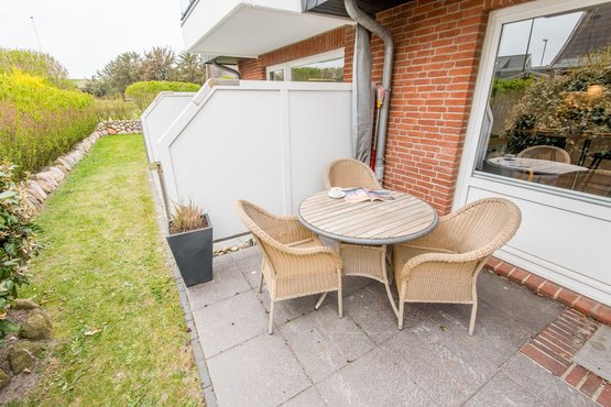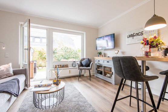 Mit Terrasse nach Süden. Direkt hinter den Dünen in Westerland auf Sylt, inklusive Meeresrauschen. Nichtraucherwohnung. Wohnzimmer mit ausziehbarem (Schlaf-) Sofa, elektrisch verstellbarem Sessel und TV. Direkter Zugang zur möblierten Gartenterrasse nach Süden.