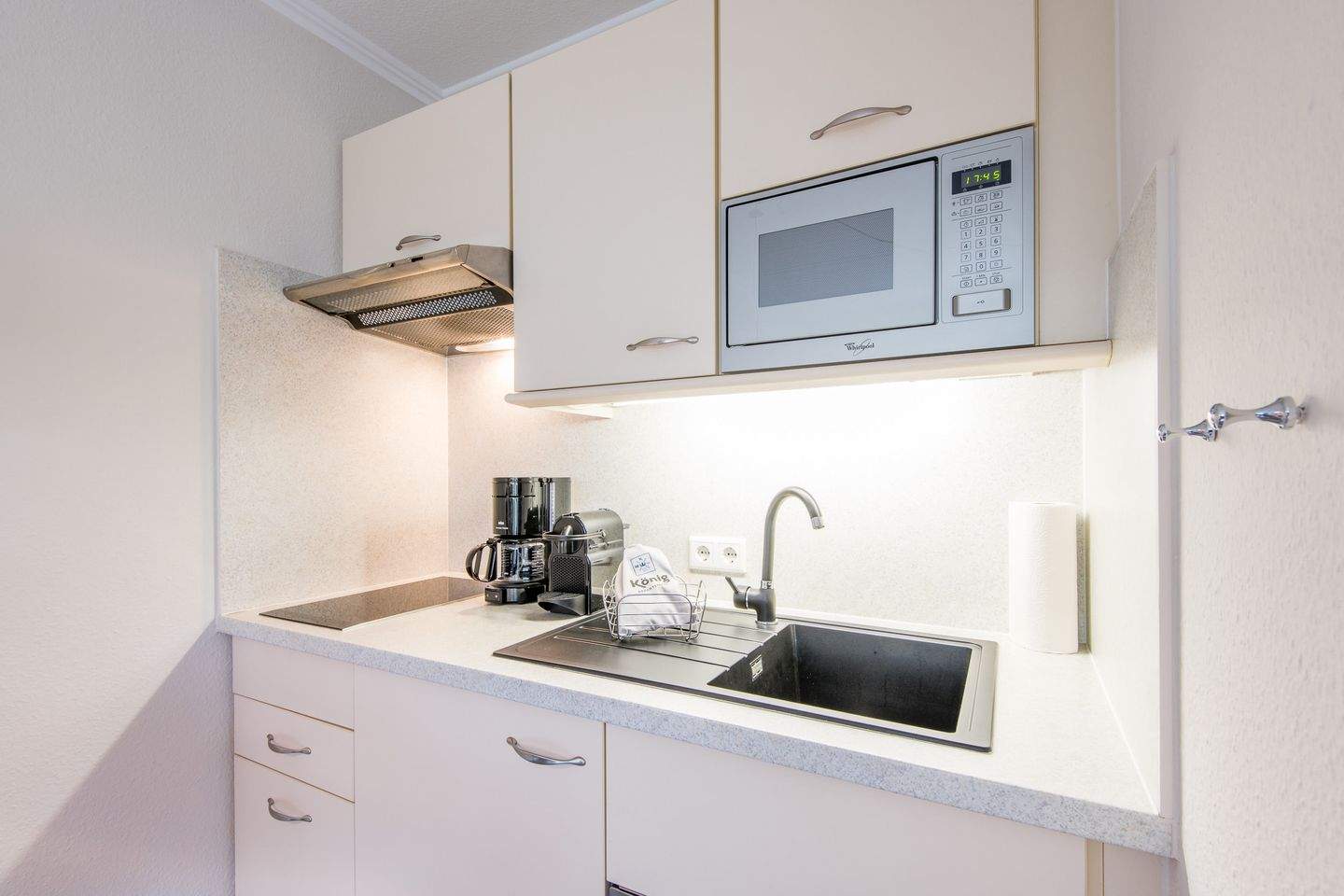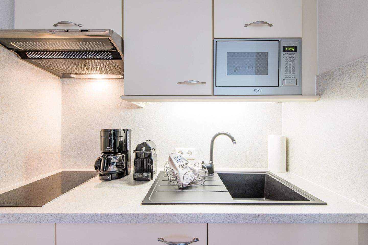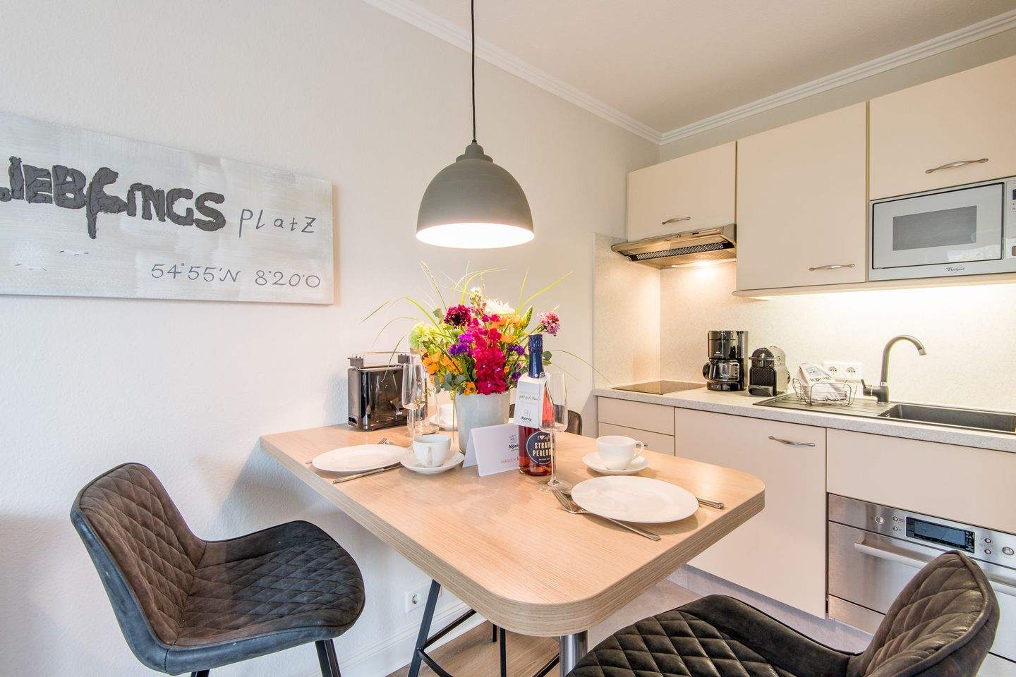 Offene Küche mit 2-Platten-Herd, kleinem Geschirrspüler, Filterkaffeemaschine und dem üblichen Komfort. Essgruppe mit 3 Stühlen.