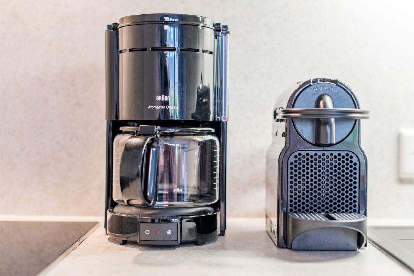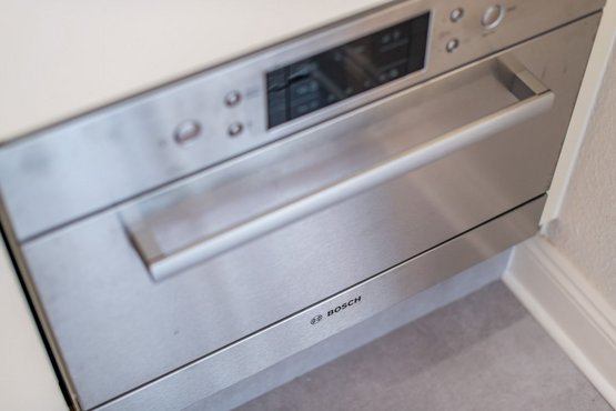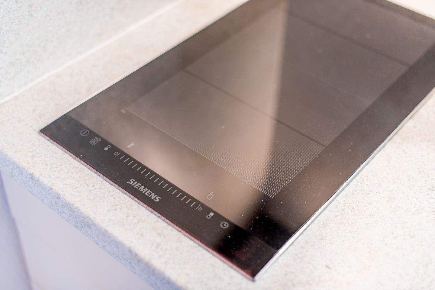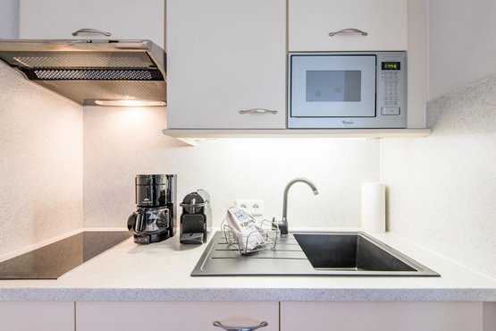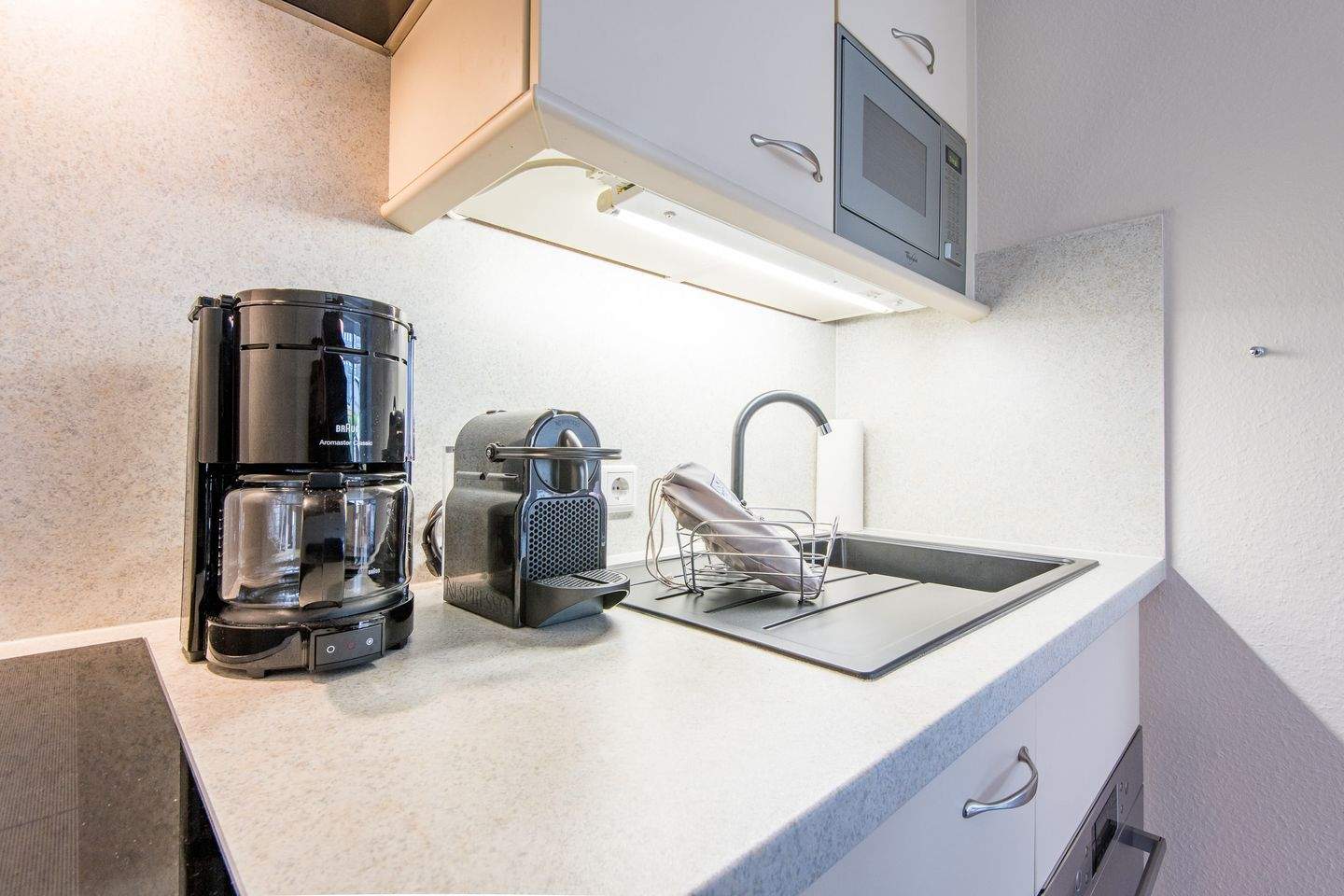 Offene Küche mit 2-Platten-Herd, kleinem Geschirrspüler, Filterkaffeemaschine und dem üblichen Komfort. Essgruppe mit 3 Stühlen.