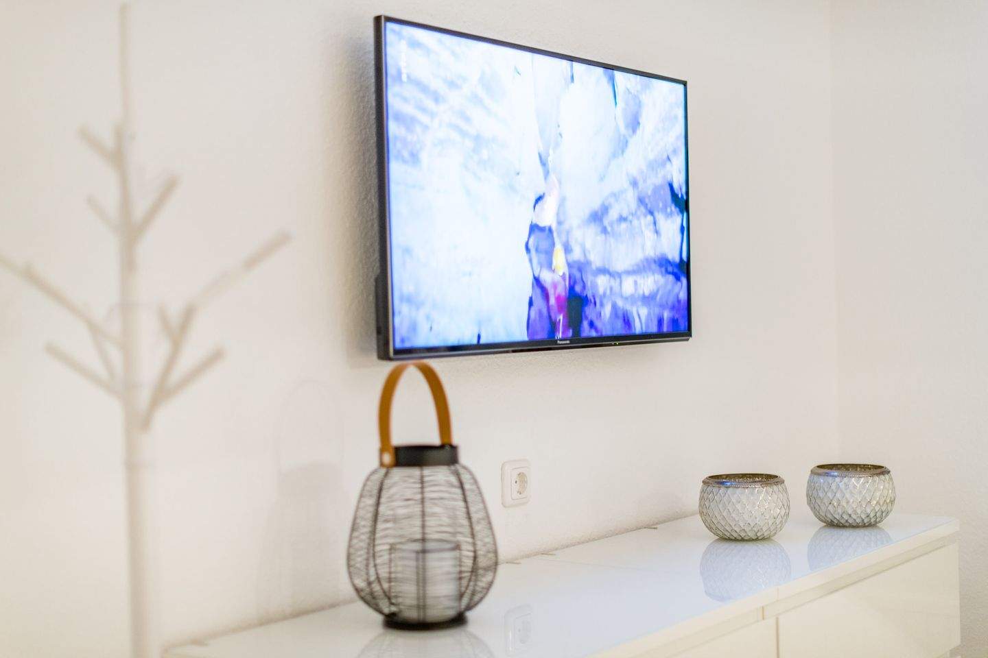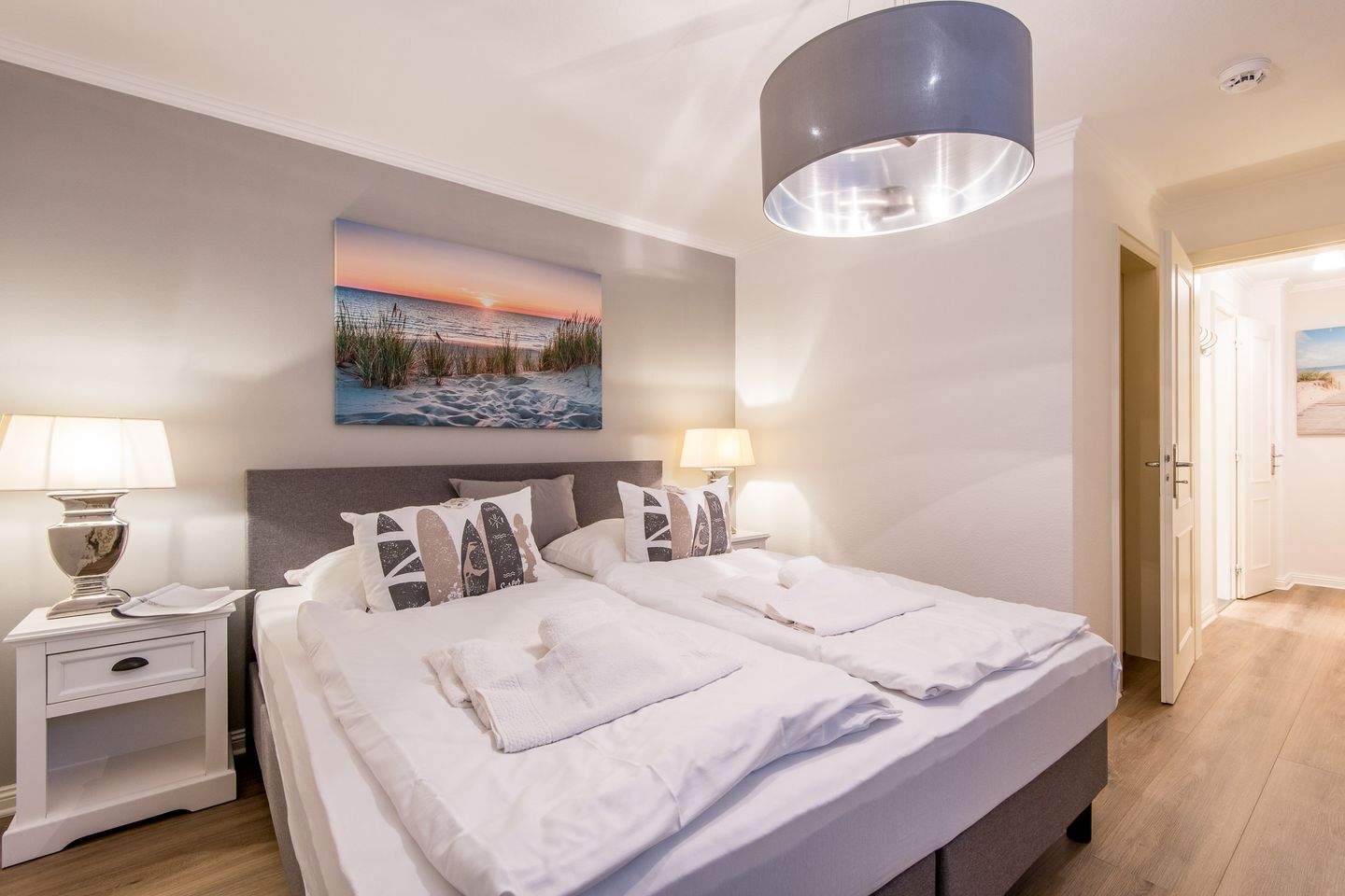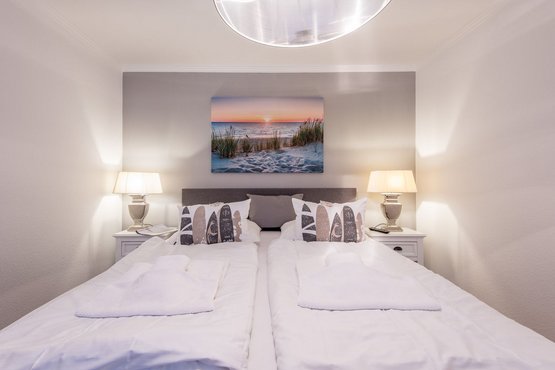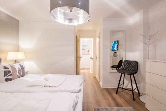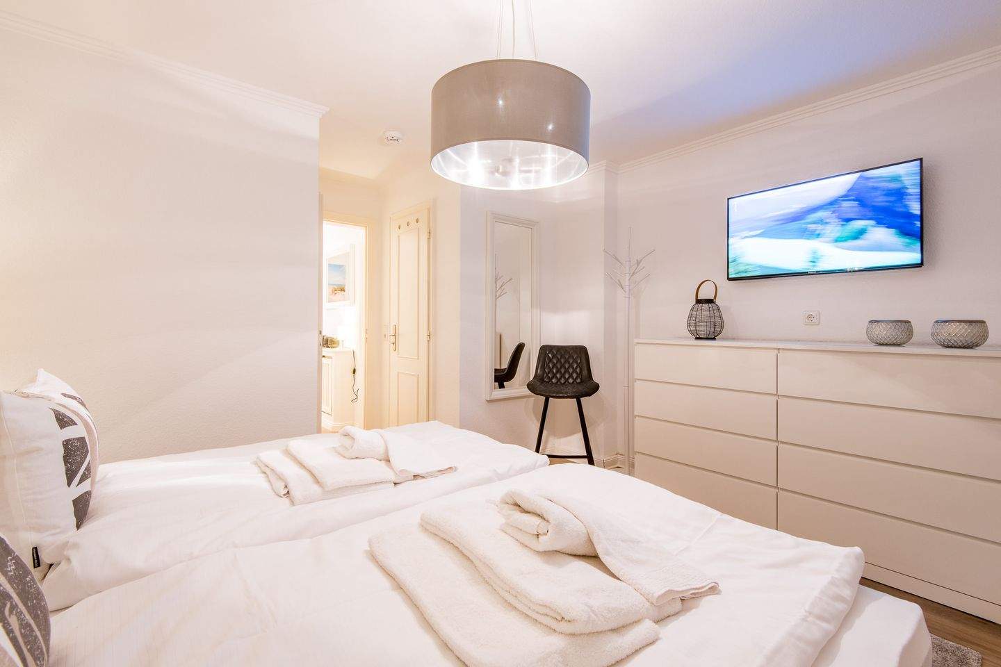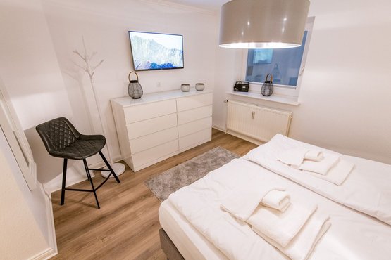 Schlafzimmer mit Doppelbett (2x 90x200cm), Kleiderschrank und TV.