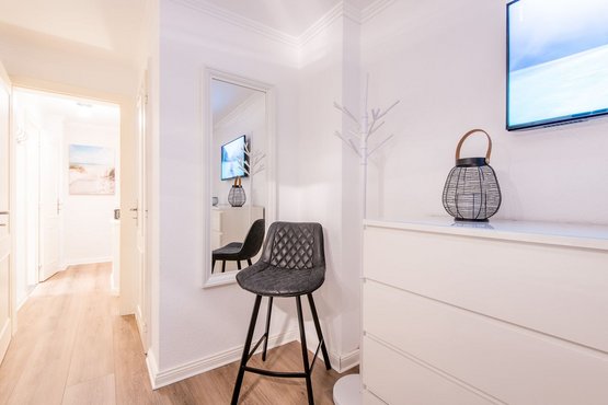 Flur mit Garderobe im Eingangsbereich. Waschmaschine und Trockner kostenlos zur Allgemeinnutzung im Haus. WLAN und Pkw-Stellplatz vorhanden.